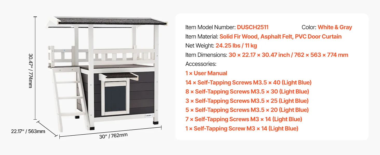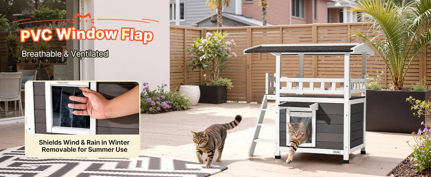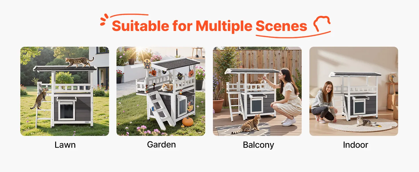 VEVOR Outdoor Cat House, 2-Story Wooden Cat Shelter with Stairs & Balcony, Elevated Feral Kitty Shelter, Spacious Room, Waterproof Cats Condos for Indoor & Outdoor Cats in Winter 76 x 56 x 77 cm