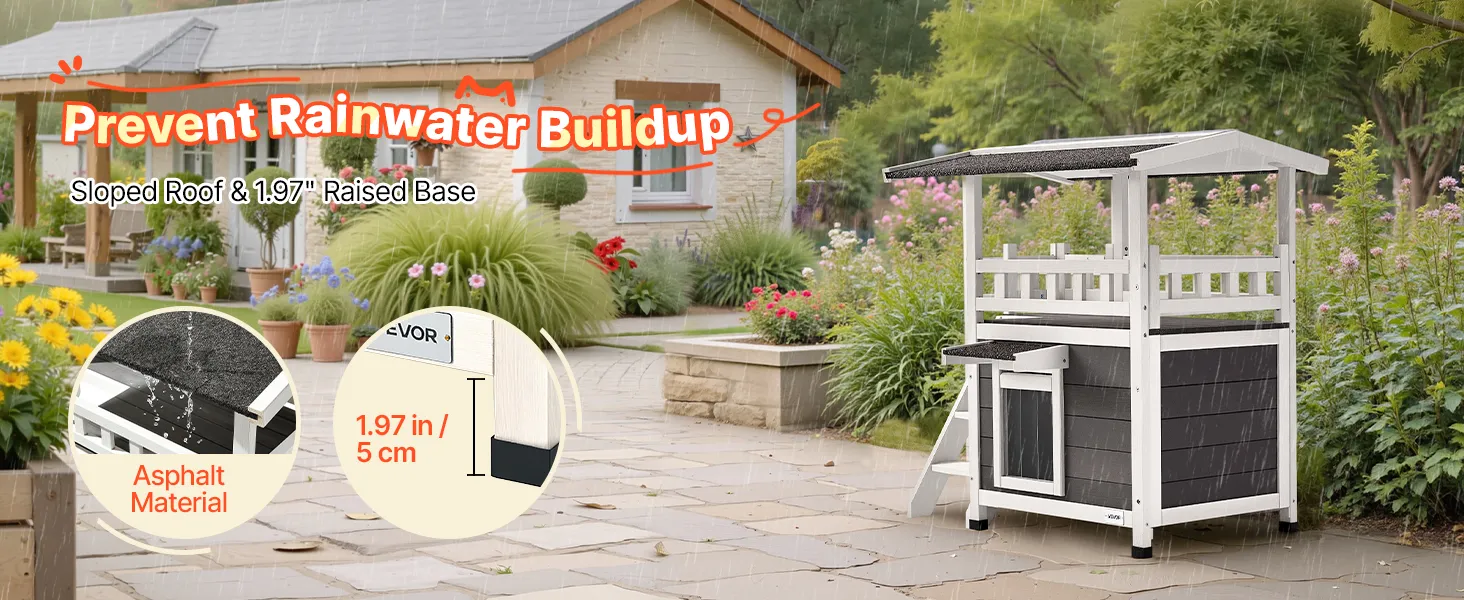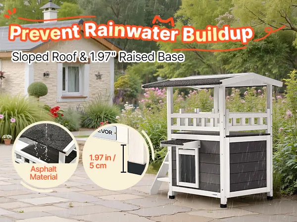 The feral cat shelter with asphalt sloped roof and 2.64" (6.7 cm) raised base that keep out rain, moisture, and cold. Ensures cats stay warm and dry year-round.