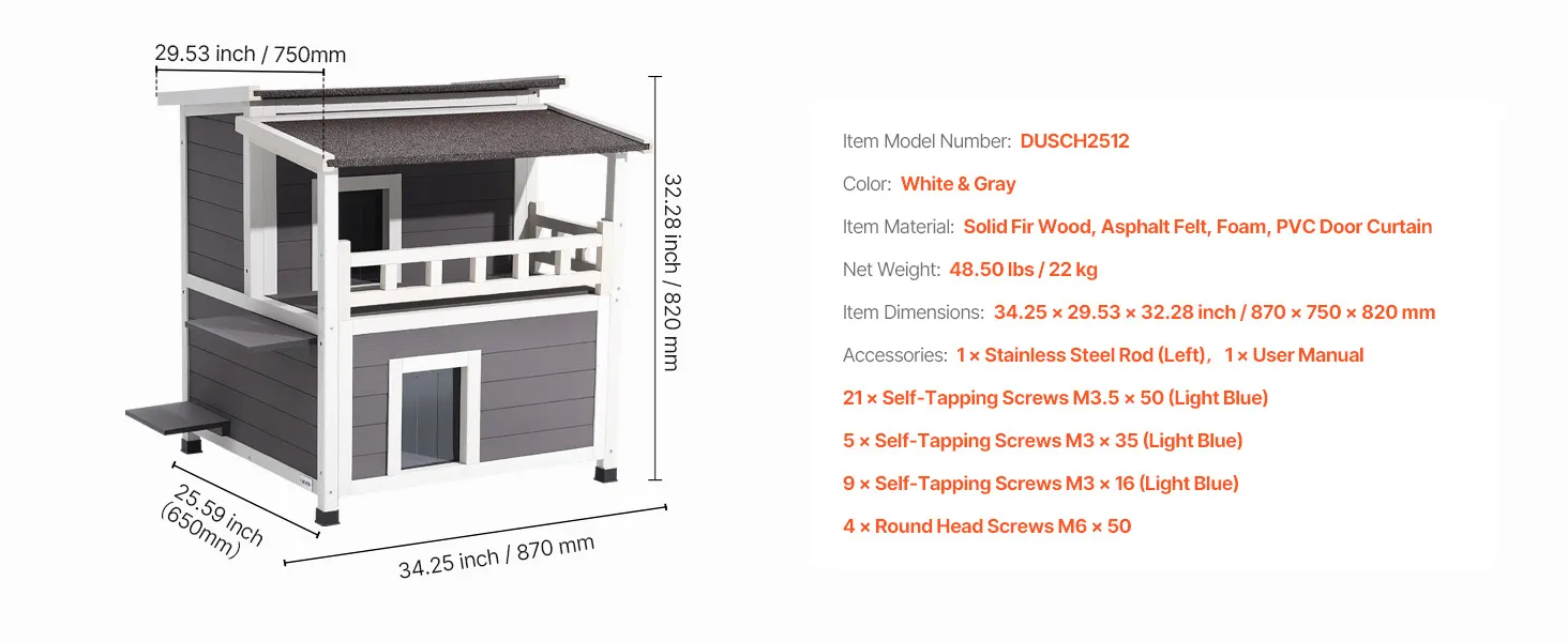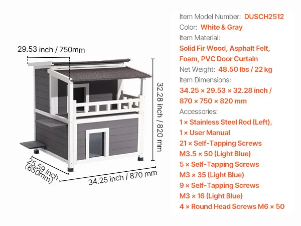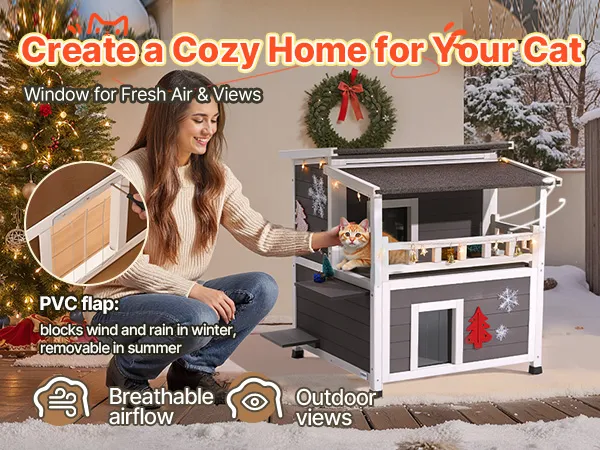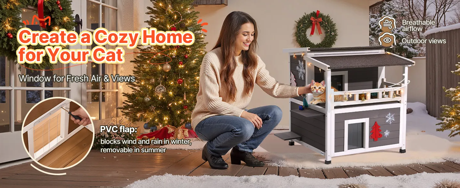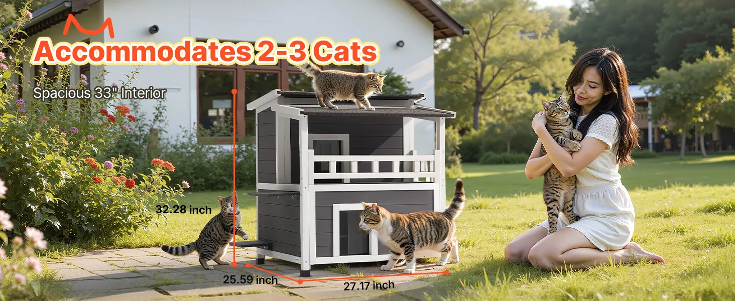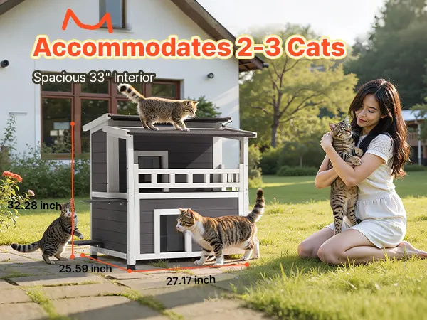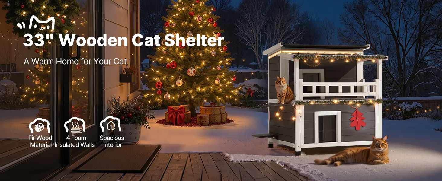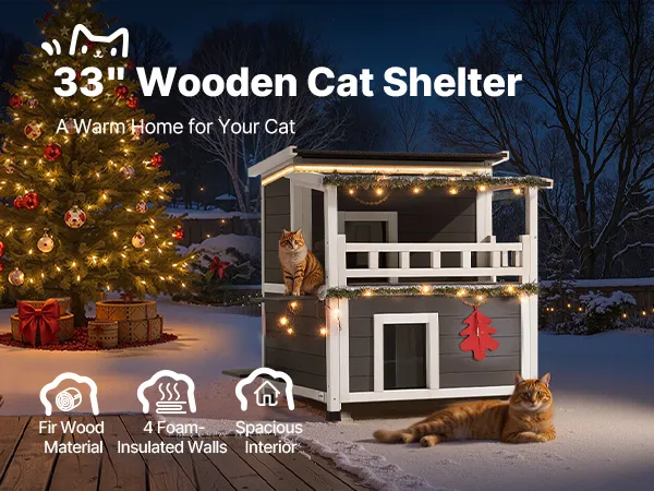 Built from quality fir wood, the 33 in wooden cat shelter is sustainable and long-lasting. Four-sided foam insulation keeps cats warm in cold weather, while the spacious interior allows climbing and play.