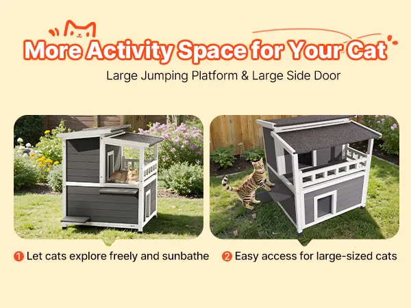 This elevated cat house features large side door that makes it ideal for bigger cats or multi-cat families. A raised jumping platform gives cats extra space to climb, explore, and bask in the sun.
