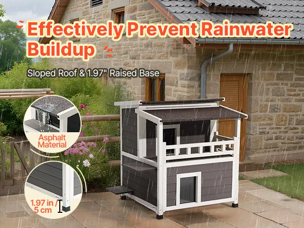 Our outdoor cat house with sloped asphalt roof avoids rain buildup and enhance comfort for cat. A 1.97 inch / 5 cm raised base keeps out ground moisture and cold, ensuring a dry, cozy environment.