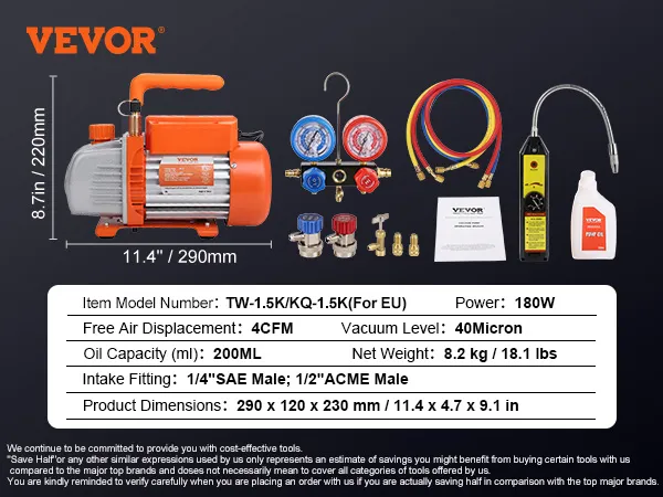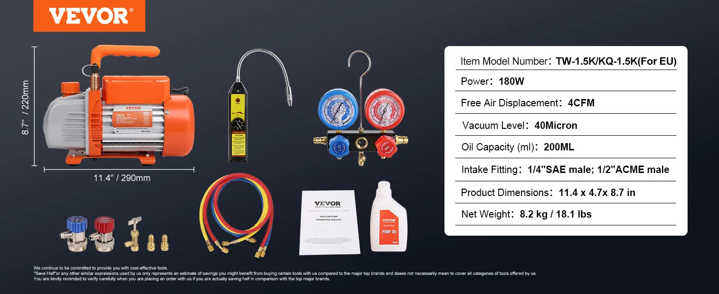 • Sunkiųjų Dulkių Siurblys: vienpakopiai siurbliai skirti didesnį ir pastovesnį ribinį vakuumą. Jis teigia, oro kondicionavimo sistema, efektyviai juda drėgmės, prieš pildymo ji su šaltnešio. Laisvo Oro Tūris: 4 CFM, Ribinis Vakuumas: 40 mikronų, Įsiurbimo Įrengimas: 1/4"SAE vyrų ir 1/2"ACME vyrų, Greitis: 1450PRM, Įtampa/Dažnis: AC230V, 50Hz, Galia: 180W, Alyvos Talpa: 200 ml.