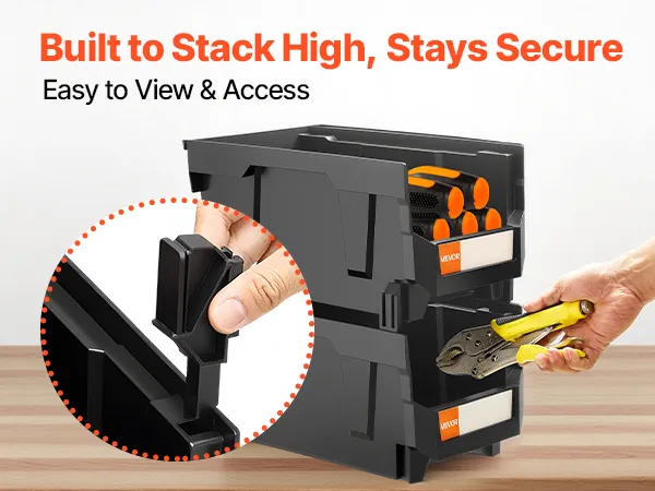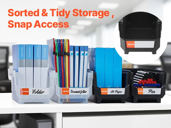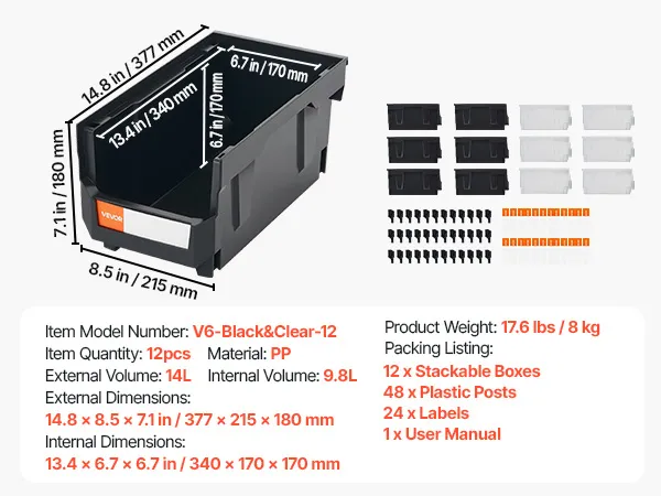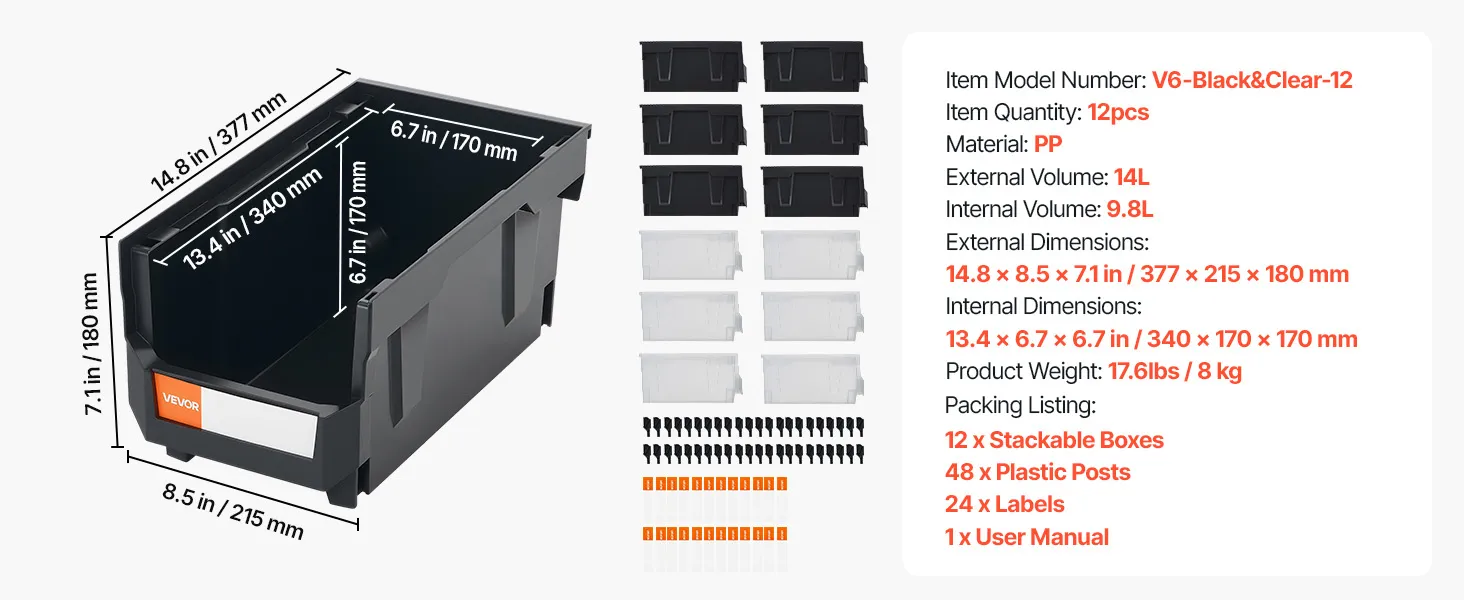 VEVOR 12-Pack Stackable Plastic Storage Bins 37.7×21.5×18 cm, Black & Transparent, for Garage, Office & Small Parts