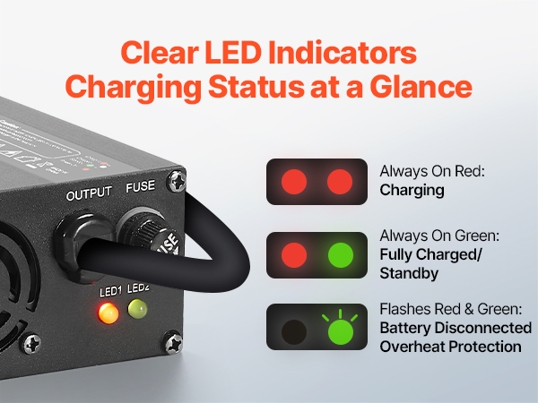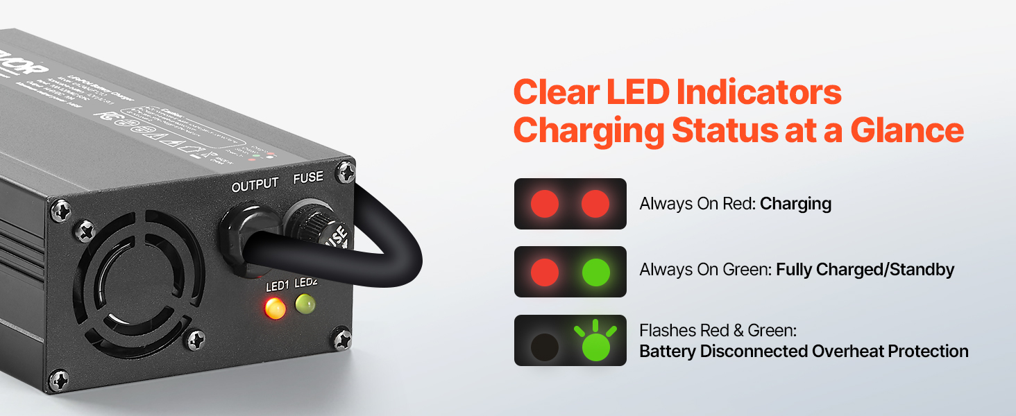 Mūsų LiFePO4) baterijos kroviklį apima DC išėjimo, LED indikatoriai, ir aušinimo ventiliatorius efektyvus ir patikimas įkrovos.