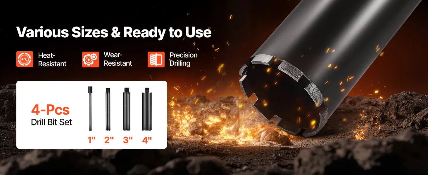 VEVOR Diamond Core Drilling Machine, 20-160 mm Drilling Diameter, Handheld Dry and Wet Concrete Core Drill Rig with 4 Drill Bits, 0-1800RPM Variable Speed, UNC1 1/4-7, for Concrete Brick Stone, 2000W
