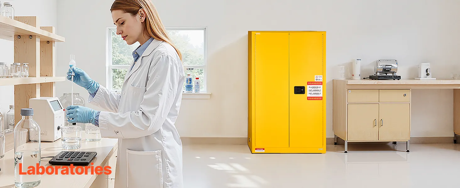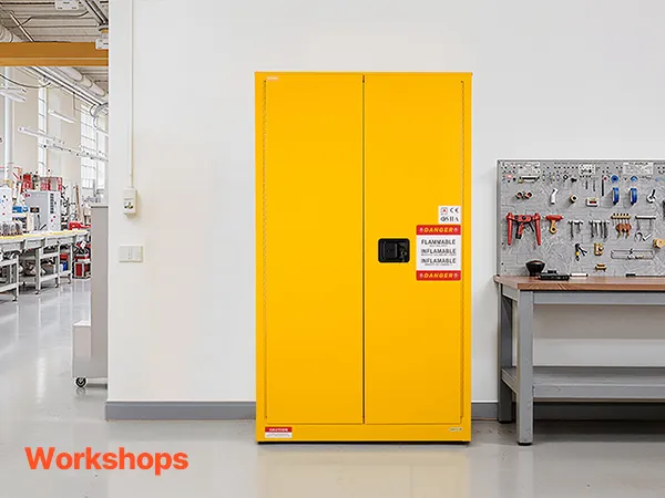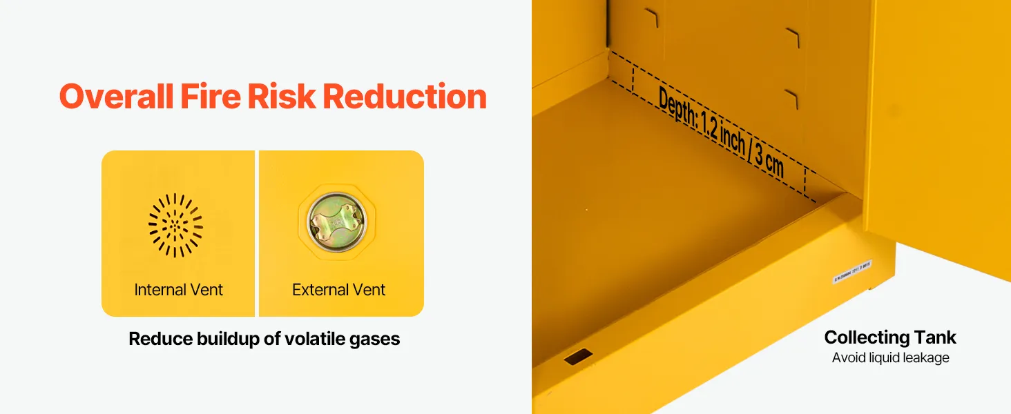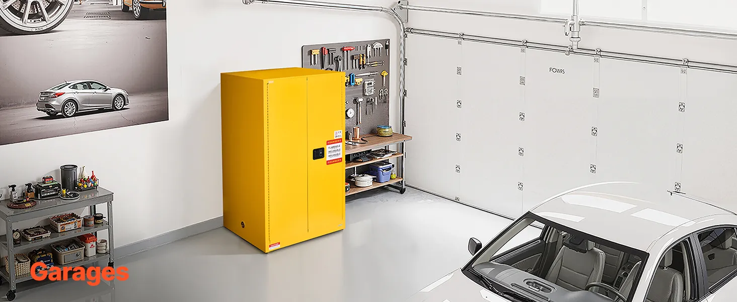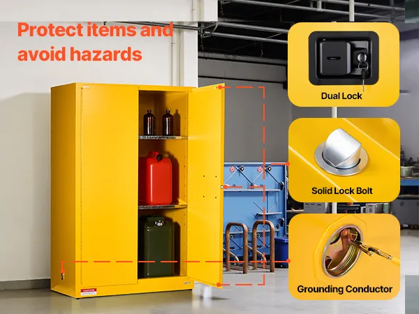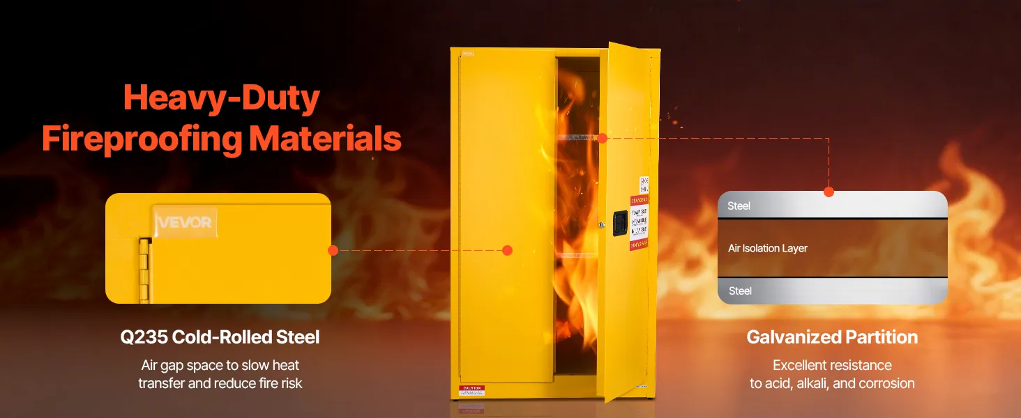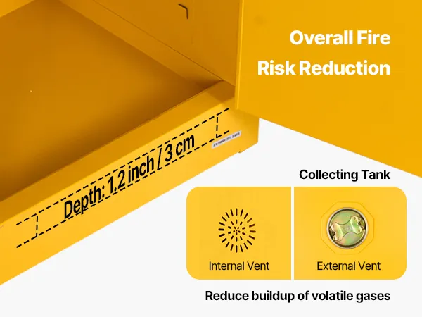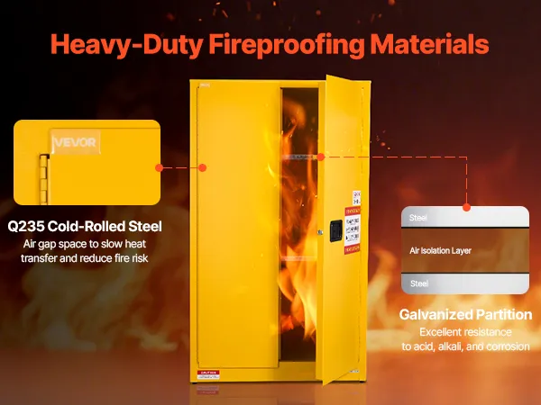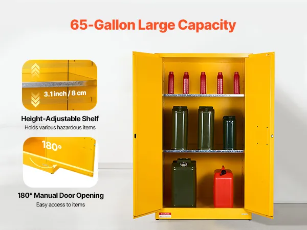 Made of Q235 cold-rolled steel with a welded body, our 65 gallon cabinet is durable and resistant to corrosion and deformation. It features vents, a sump, and a grounding wire for explosion and static prevention. Suitable for storing various flammable materials in workshops, factories, and garages.