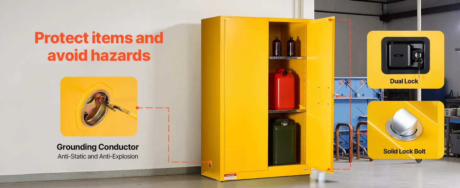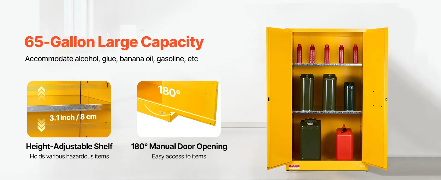 VEVOR Flammable Cabinet, 96.4 x 86.4 x 165.1 cm, 65 Gallon Flammable Storage Cabinet with Adjustable Shelf, Cold-Rolled and Galvanized Steel Fire Cabinets, for Commercial Industrial Home Use, Yellow