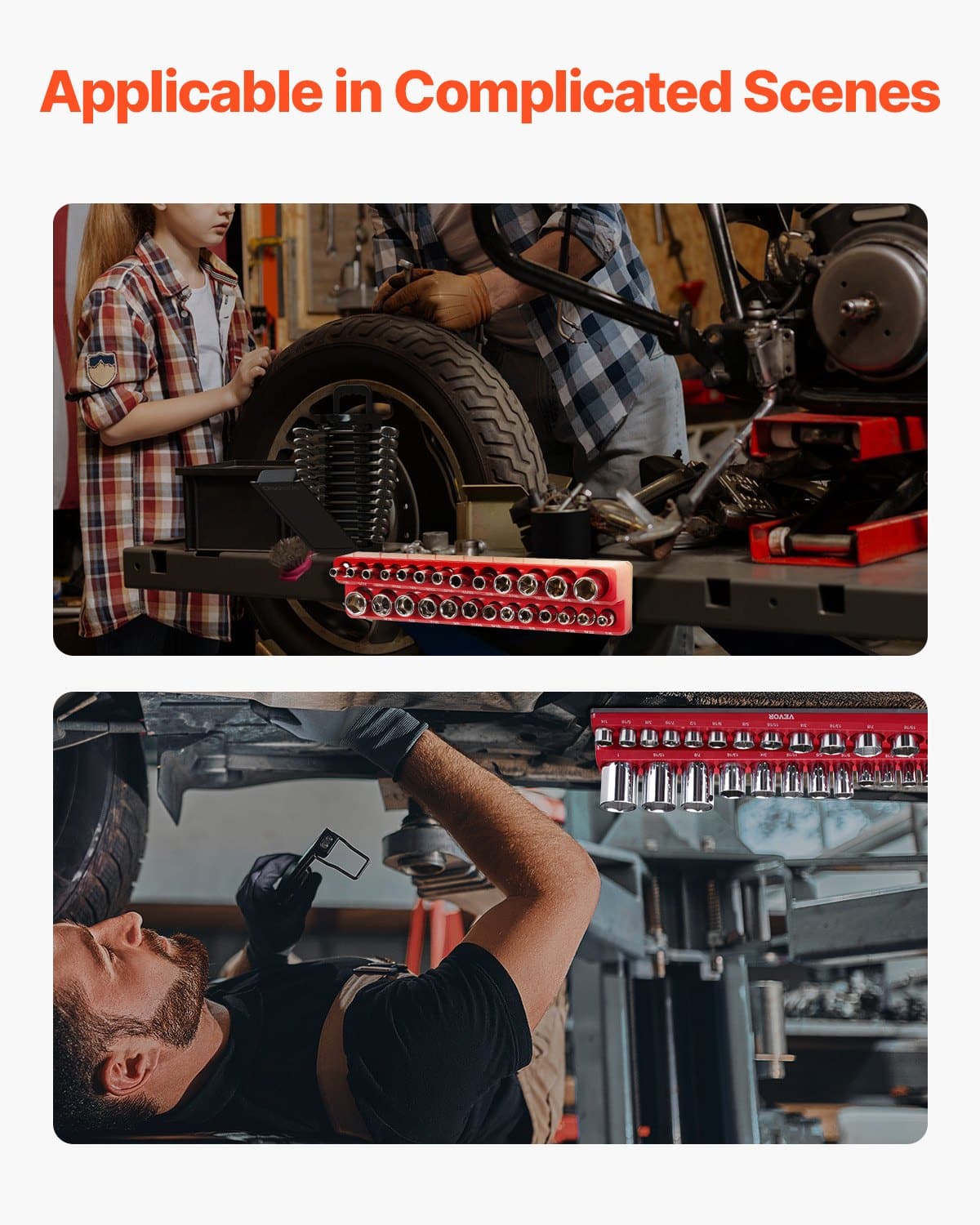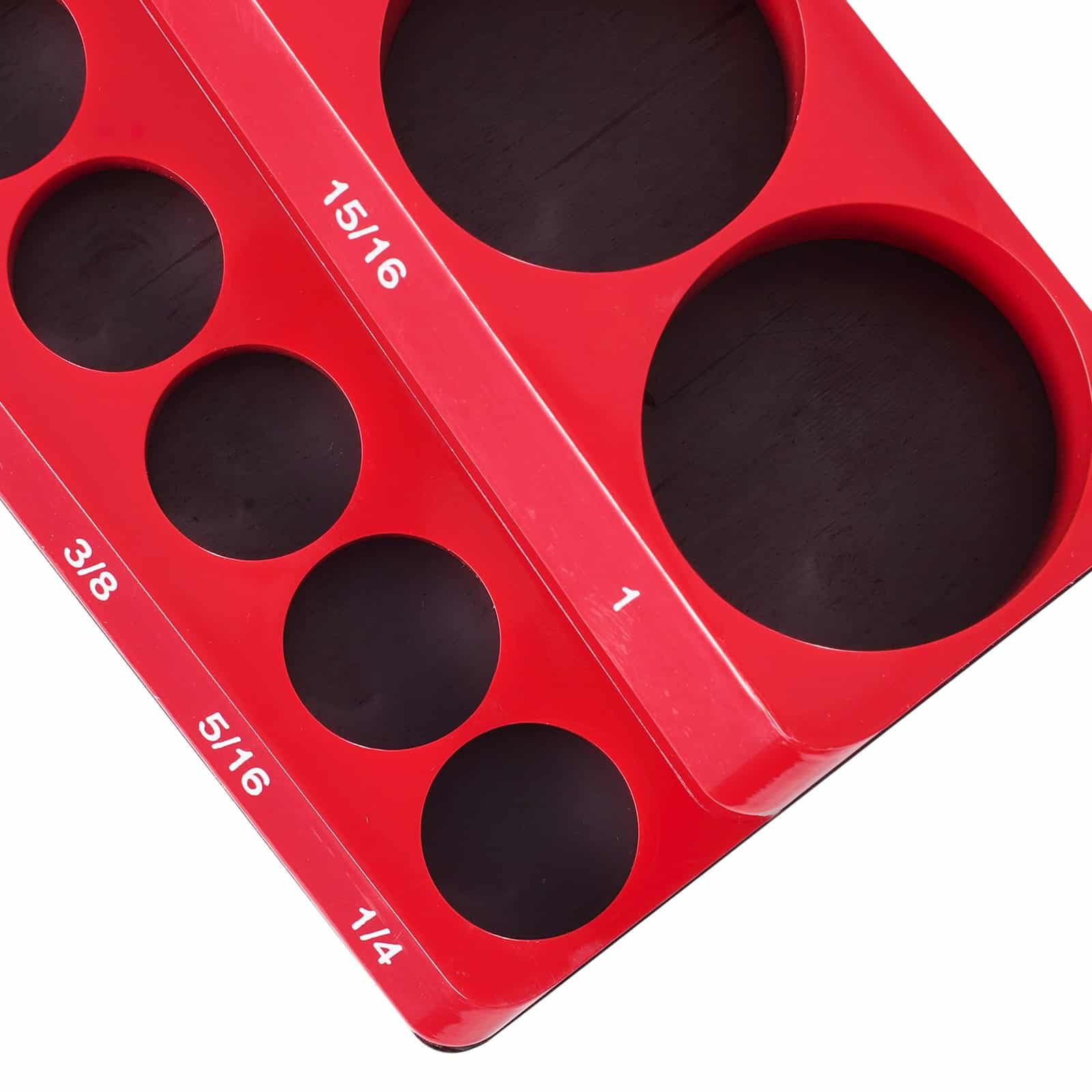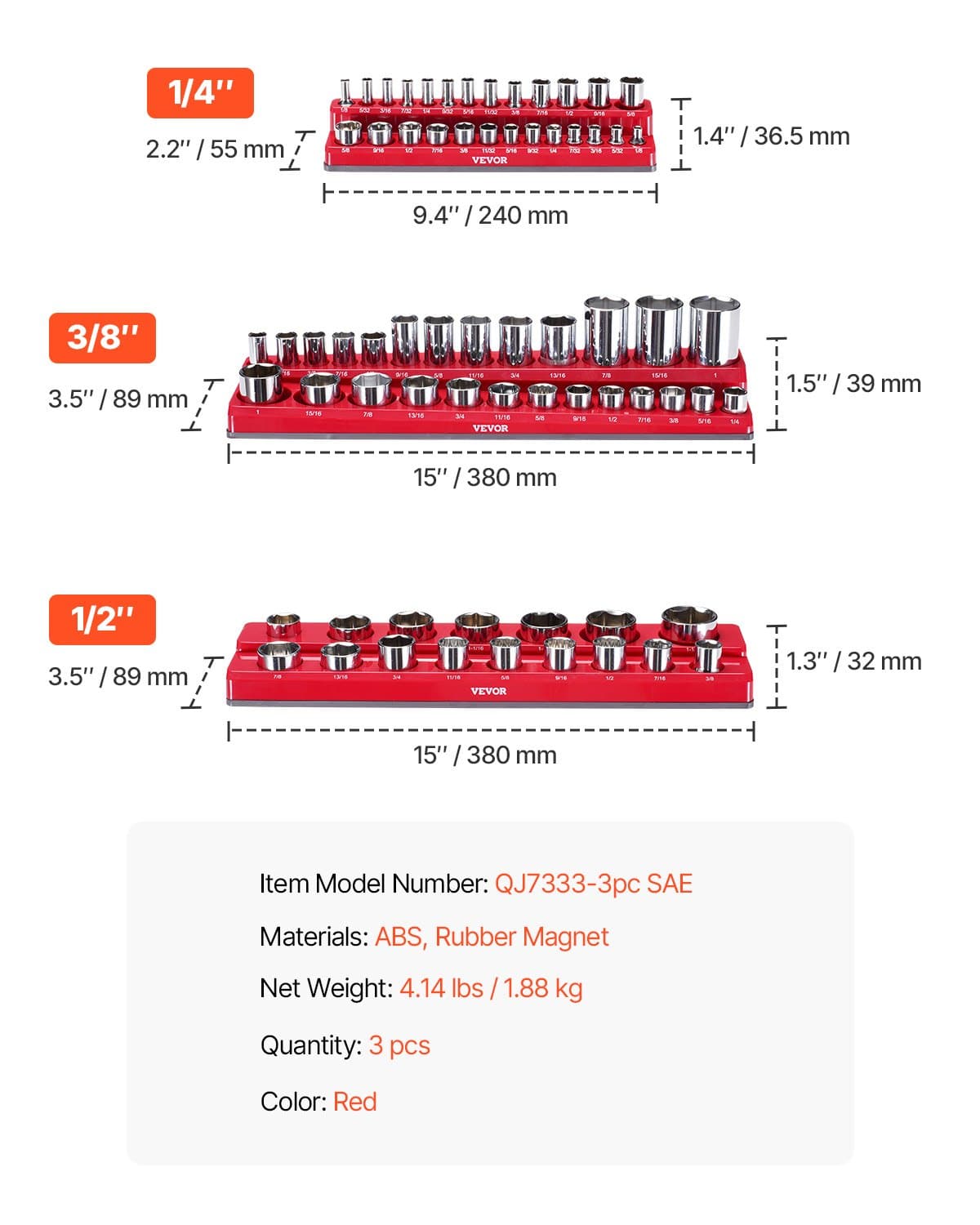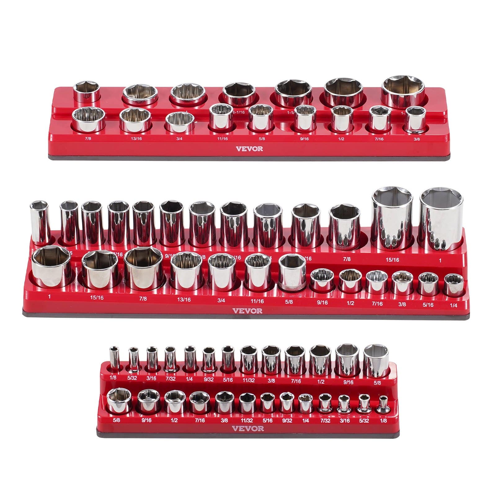 VEVOR magnetinių lizdų organizatoriaus rinkinys, 3 vnt magnetinių lizdų laikiklis, 1/4', 3/8' ir 1/2' SAE lizdų padėklai su aiškiomis etiketėmis, laikykite iki 68 vnt standartinių ir gilių lizdų, raudoni (lizdai neįtraukti)