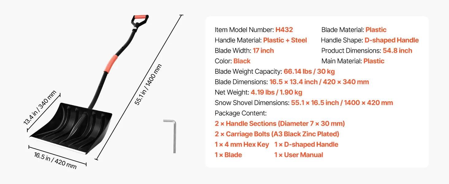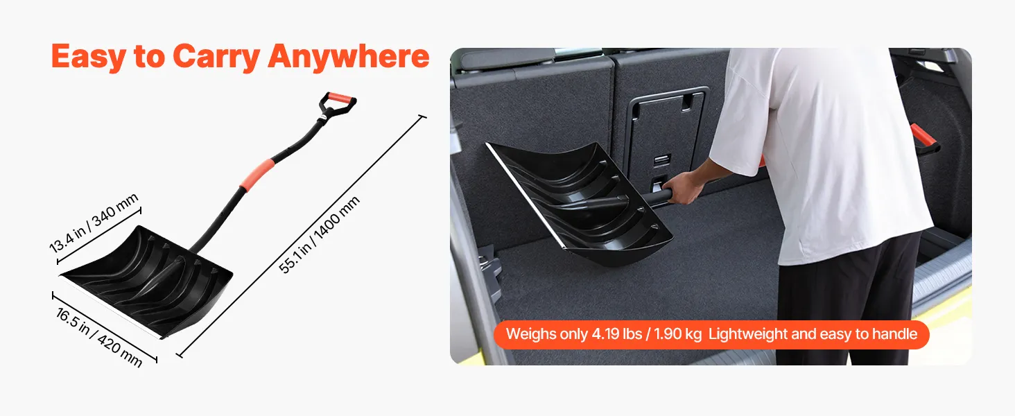 • Easy to Assemble & Carry: Comes with a user manual and tools, our lightweight snow shovels allow quick setup with no extras needed. Weighing only 4.19 lbs, it’s portable to carry, ideal for camping, travel, or outdoor adventures as an emergency tool
