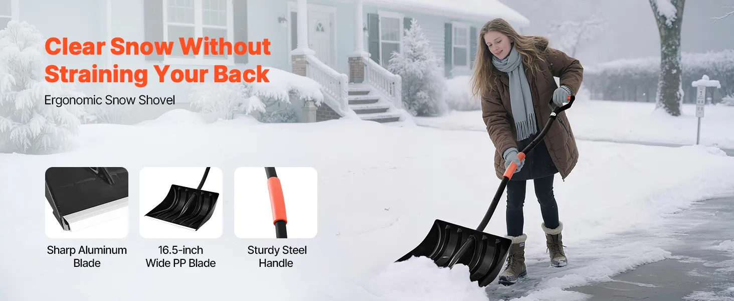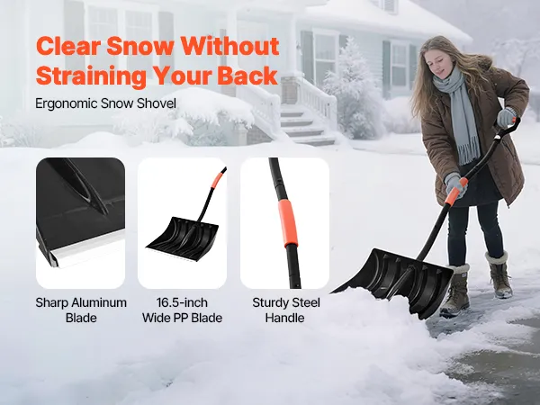 • Efficient Snow Shoveling: This snow shovel for driveway includes a 16.5 x 13.4 in widened shovel head and an aluminum blade, suitable for cleaning dry or wet snow. It clears large areas like driveways and walkways quickly, saving time and effort.