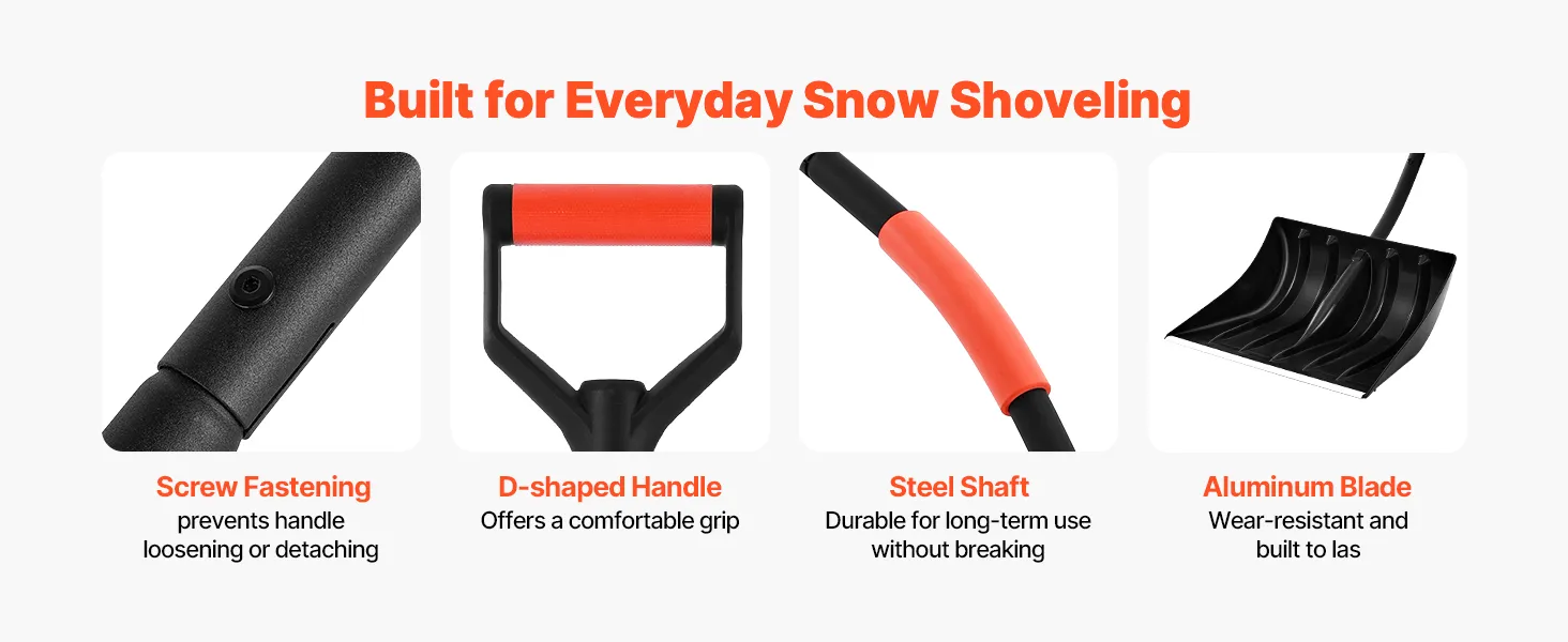 VEVOR 42 cm pločio sniego kastuvas su aliuminio ašmenimis ir D formos rankena, lengvas ir patvarus įrankis sniego valymui kieme ir lauke