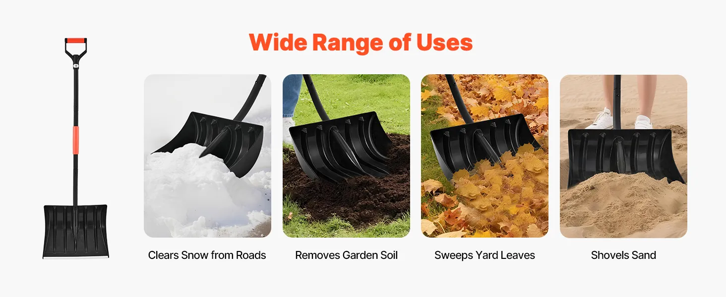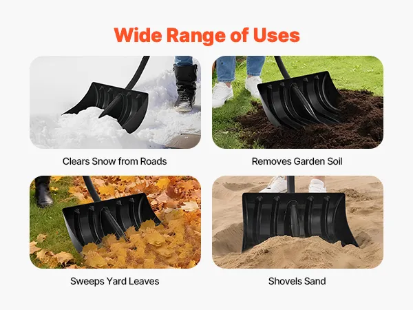 • Multi-Scenario Uses: The plastic snow shovel is not only suitable for clearing snow around houses, driveways, and sidewalks, but also for gardening, leaf cleaning, or outdoor sand moving. A practical tool for daily home use or outdoor camping