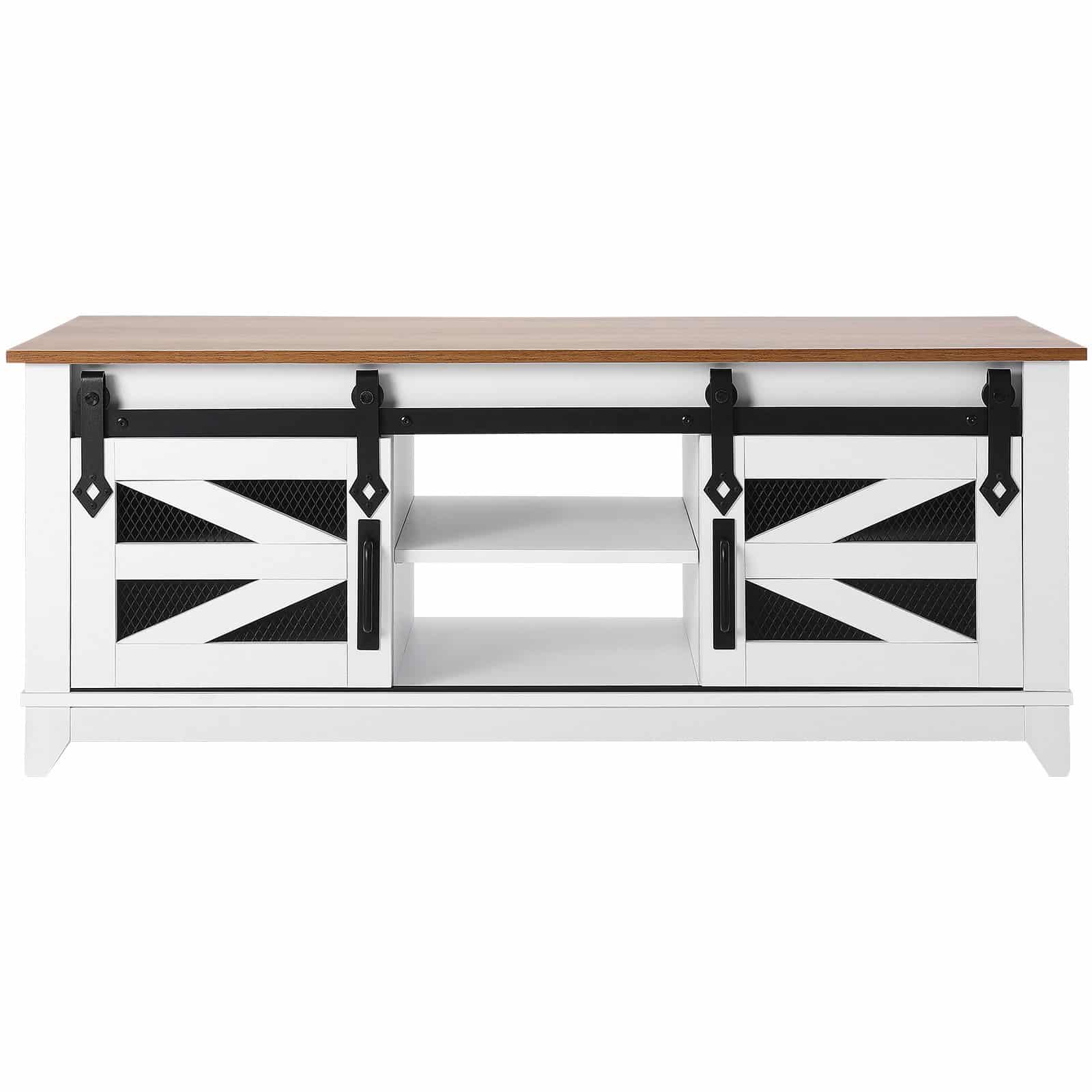 VEVOR 48" Farmhouse Coffee Table, Rectangle Coffee Table with 2 Sliding Barn Doors, 2 Tiers Wooden Rustic Table with Removable Shelves for Living Room, Bedroom, Apartment, or Studio, White & Natural