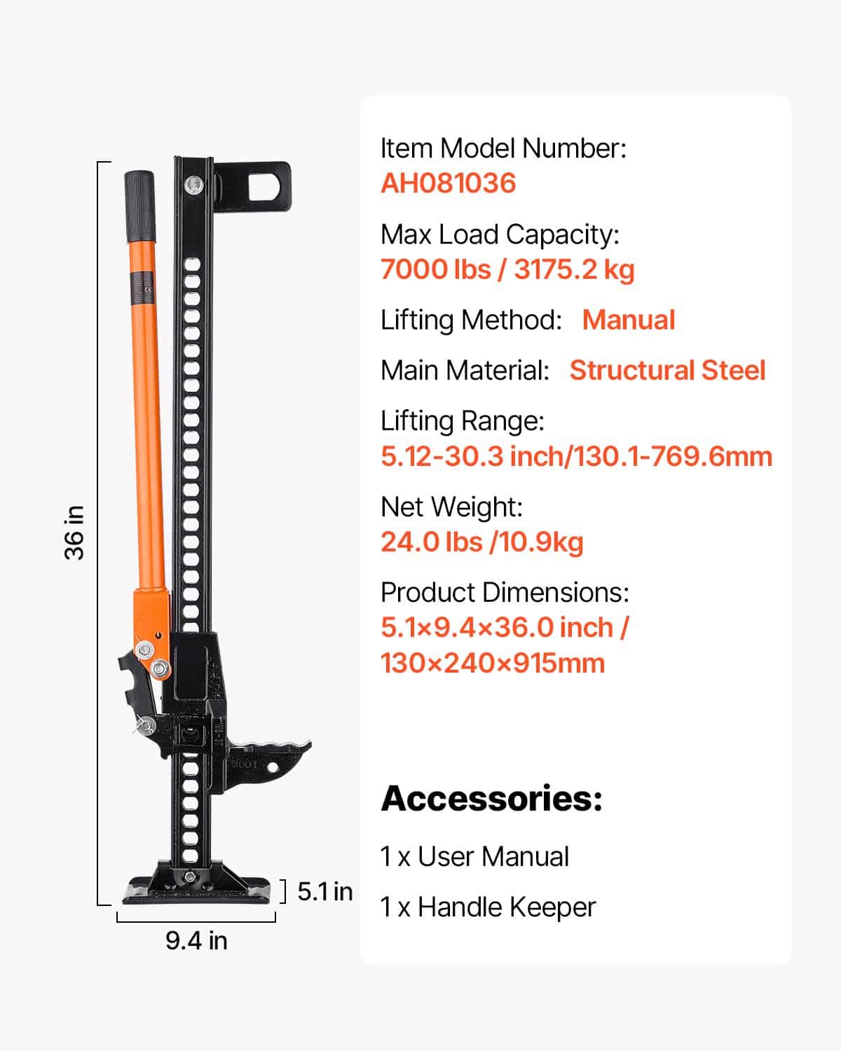 VEVOR Farm Jack, 91,5 cm Utility High Lift Farm Jack, 3,18 tonos talpos reketavimo Off Road komunaliniai domkratai, sunkiasvoriai lifto domkratai su 130,1-769,6 mm kėlimo diapazonu traktoriui, sunkvežimiui, visureigiui
