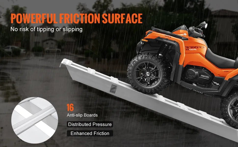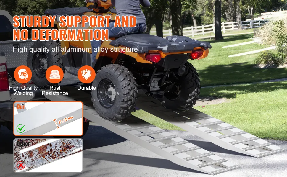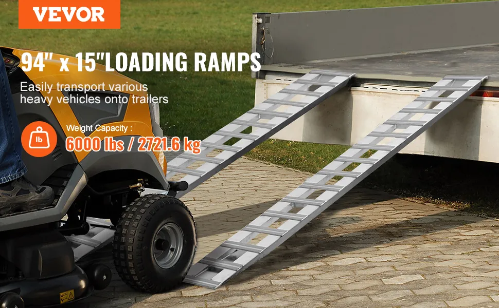 The 94" x 15" loading ramp offers strong load-bearing capacity and is suitable for loading ATVs, UTVs, hand trucks, lawn mowers, garden tractors, motorcycles, off-road vehicles, and wheelchairs. Its length provides a gentler slope for easier use on uneven terrain.