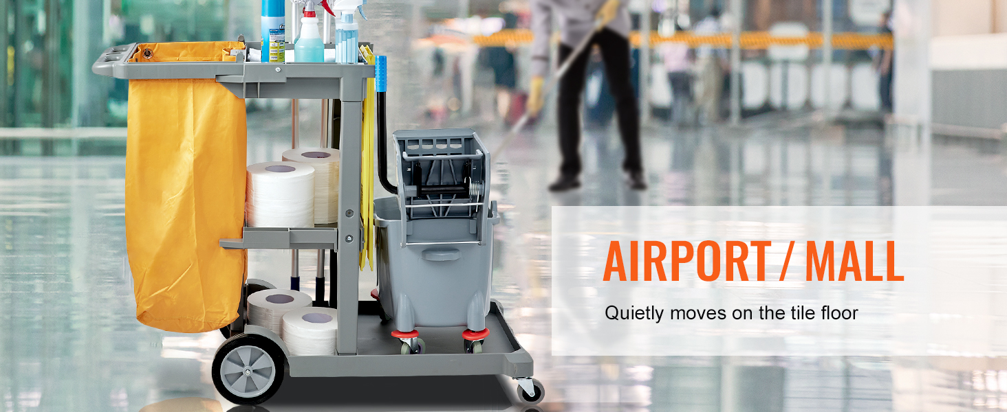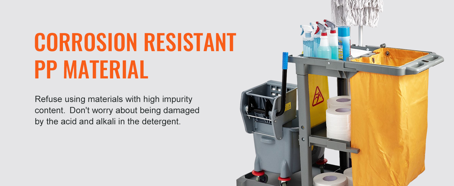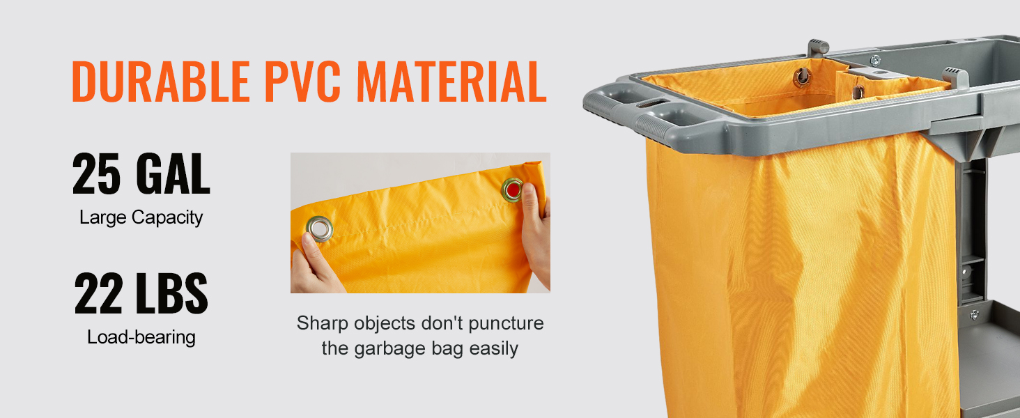 VEVOR 3 lentynų valymo vežimėlis su 94,6L PVC maišu, 90,7kg apkrova, tvirtas PP, 120x51x98cm, geltona/pilka