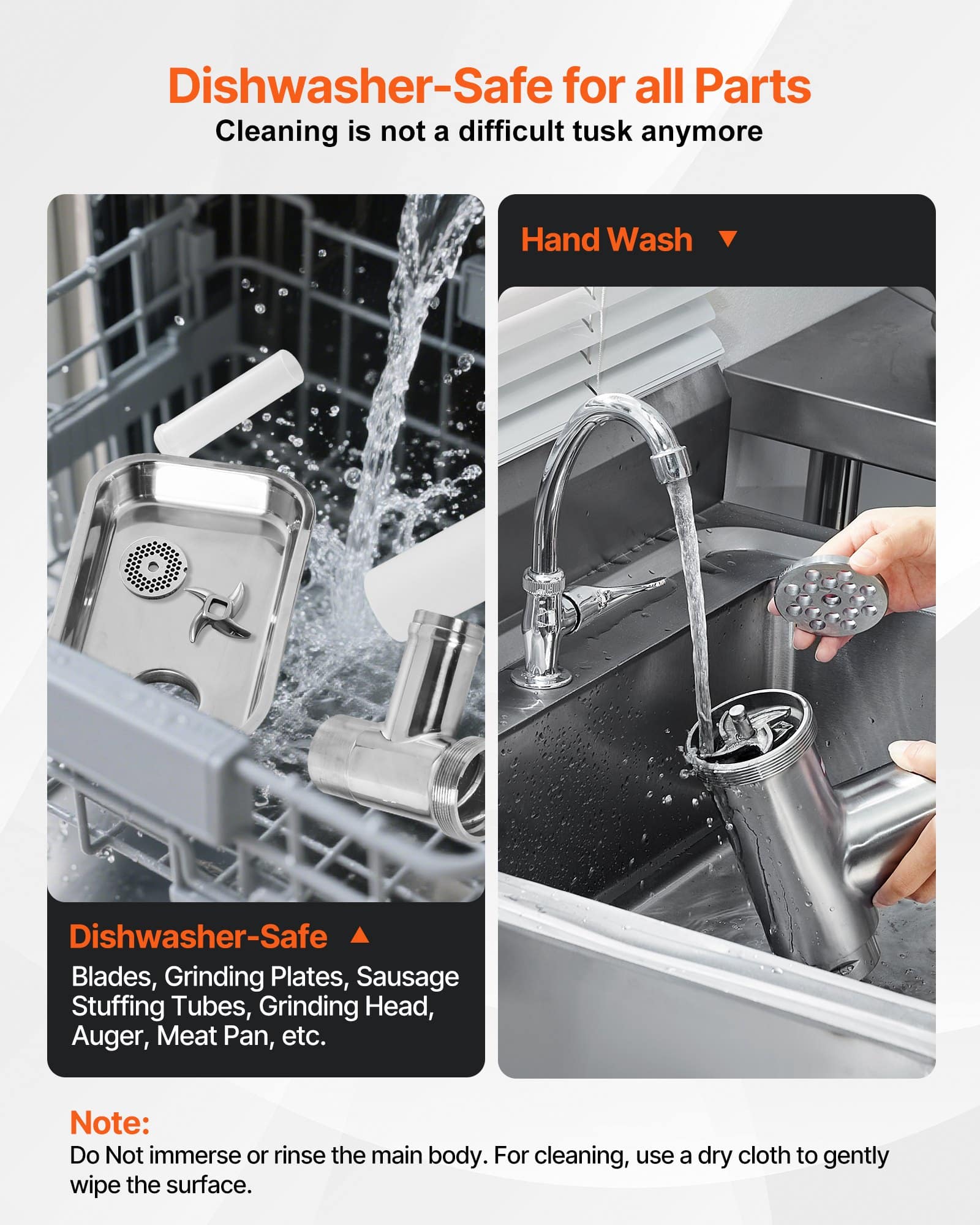 Mūsų stalviršio, mėsmalė, yra pagamintas iš tvirtos, pilnai nerūdijančio plieno, atsparus korozijai ir nusidėvėjimui. Visos dalys, kurios liečiasi su maistu, yra pagaminti iš maisto kokybės medžiagų, užtikrinančios saugumą ir ilgaamžiškumą.