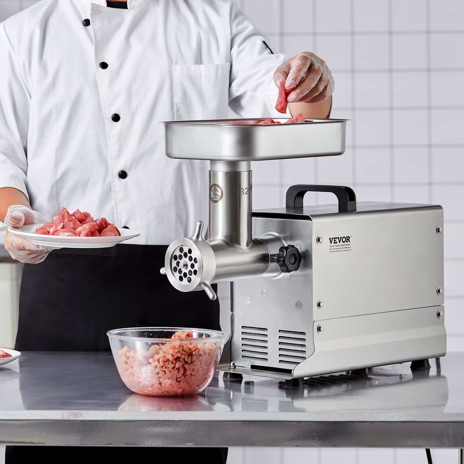 Komerciniai mėsmalė, yra trys skirtingo skersmens dešra vamzdžiai, todėl jūs galite lengvai padaryti dešros, įvairių dydžių. Puikiai tinka naudoti virtuves, barai, restoranai, maisto perdirbimo įrenginius.