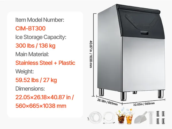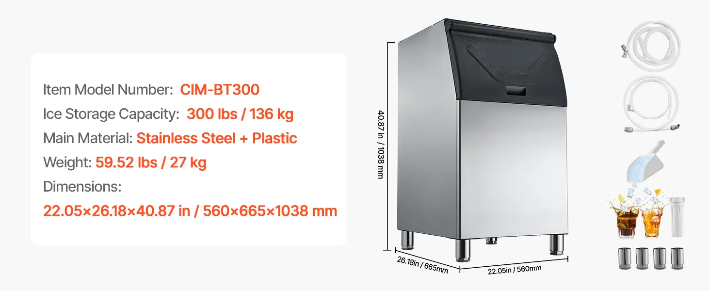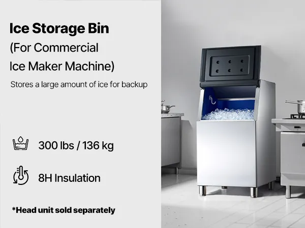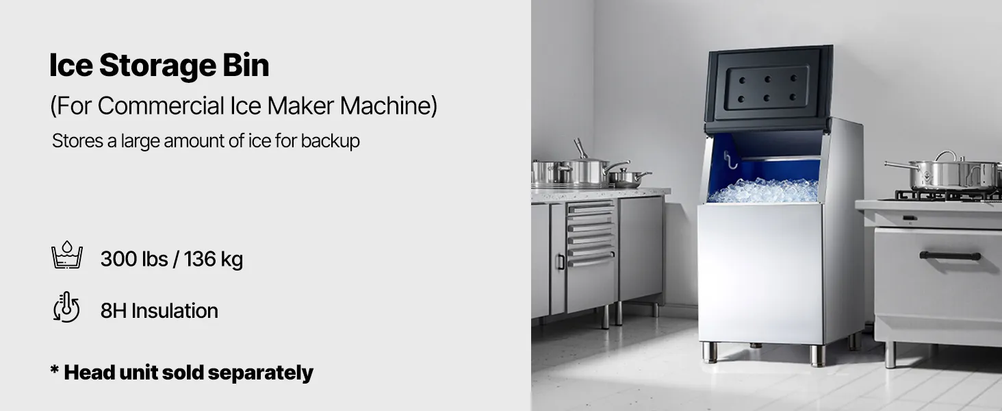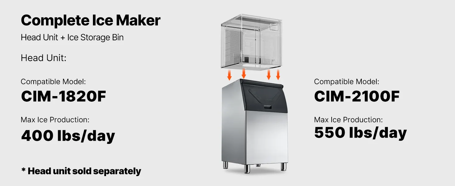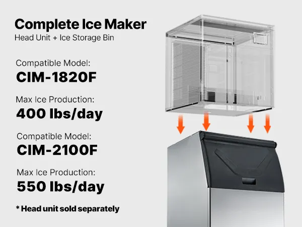 The head unit and ice bin combine to form a complete commercial ice maker. We provide a 300 lbs ice bin configuration, which is sold separately.