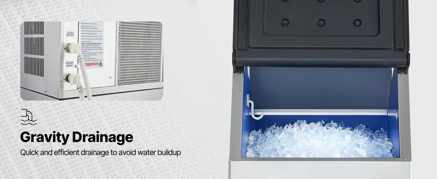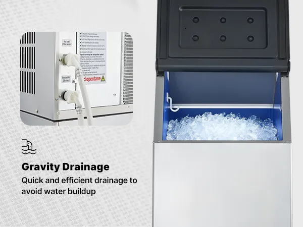 Ledo saugojimo bin funkcijos automatinis drenažo funkcija, kuri užtikrina efektyvų vandens išleidimas, išvengiama vandens kaupimosi, ir užtikrina švarų ir sveiką ledo gaminimo aplinka.