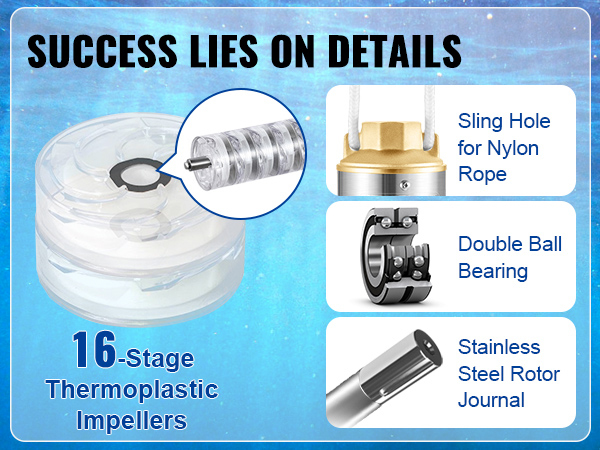 Mūsų gerai siurblys yra skirtas didelėms apkrovoms, sparnuotės ilgesnį tarnavimo laiką ir kilpos tvirtinimo taškai laido/nailono virvė. Dvigubas rutulinis guolis ir nerūdijančio plieno rotoriaus leidinys užtikrinti, mažai triukšmo ir atsparumas dilimui.