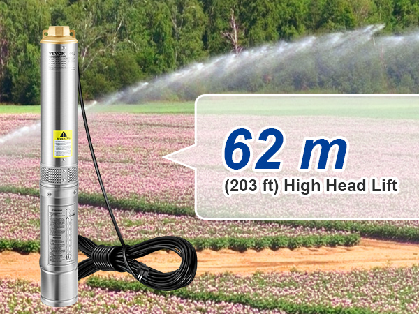 VEVOR Deep Well Submersible Pump, 750W 230V/50Hz, 105L/min 62 m Head Sand Resistant <5%, 20 m Electric Cord, 8.9 cm Stainless Steel Water Pumps for Industrial, Irrigation & Home Use, IP68 Waterproof