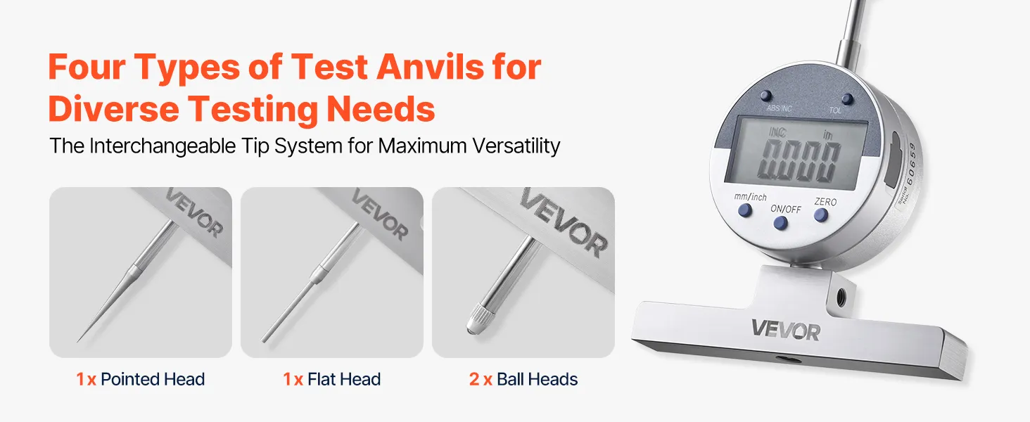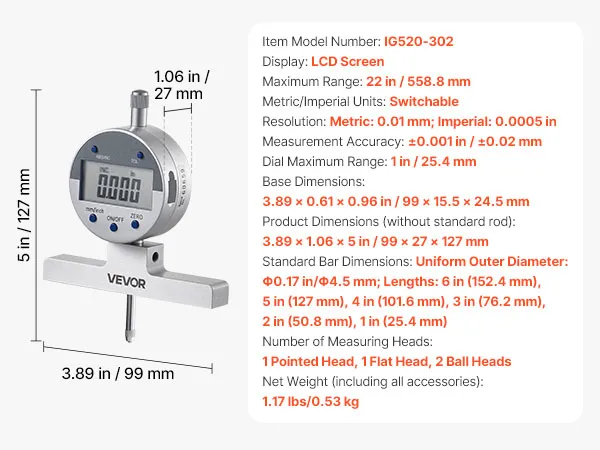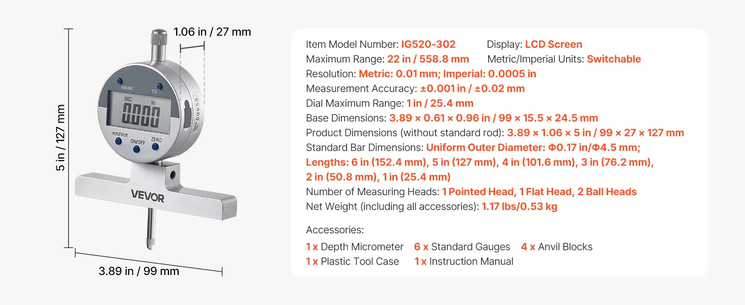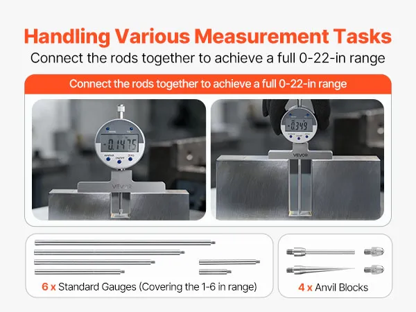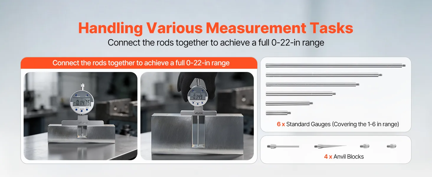 VEVOR skaitmeninis gylio mikrometras 0–558,8 mm, 0,01 mm, LCD, 4 antgaliai, 6 strypai, tikslus gylio matuoklis grioveliams ir skylėms