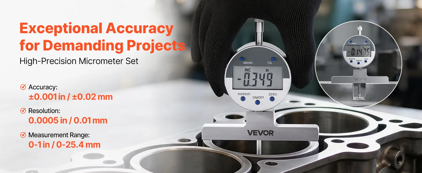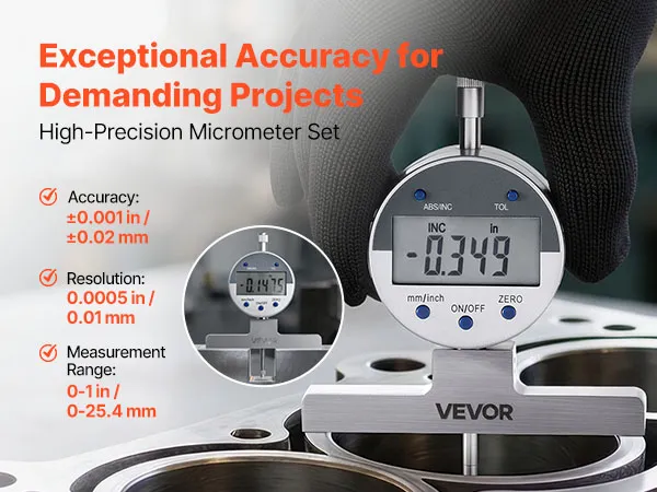 • Didelio tikslumo mikrometrų rinkinys: šis gylio mikrometras pateikia tikslius, patikimus tiesinius rodmenis su 1 -2 colio / 25,4 - 50,8 mm diapazonu, ± 0,001 colio / ± 0,02 mm tikslumu ir 0,0005 colio / 0,01 mm skiriamąja geba. idealiai tinka variklio dalims arba tiksliems komponentams matuoti