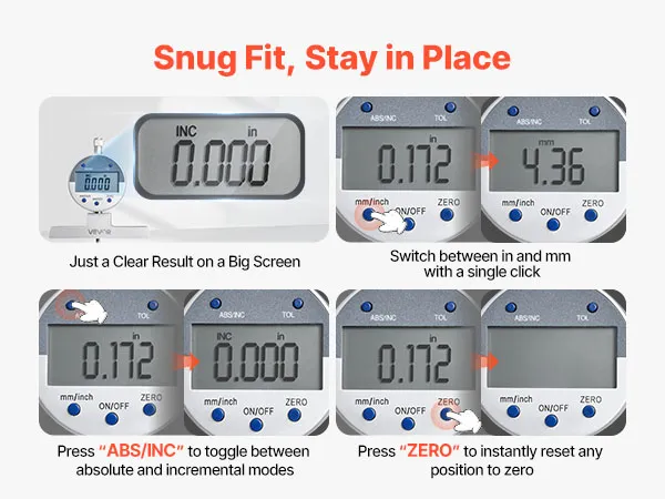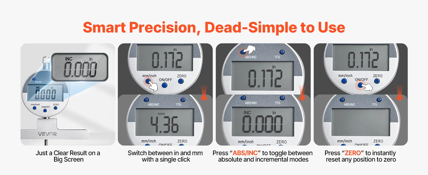 • Išmanusis ir patogus valdymas: šis mikrometras turi didelį LCD, kad būtų galima aiškiai parodyti rodmenis ir vienu mygtuku perjungti vienetą tarp imperinio ir metrinio Nulinio nustatymo funkcija leidžia kalibruoti bet kurioje padėtyje, kad būtų galima greičiau palyginti ir pakartoti matavimus
