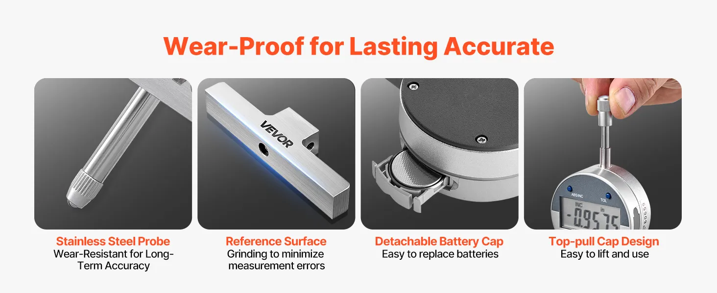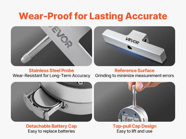 • Tikslus matavimas: šis gylio matuoklis pasižymi nerūdijančio plieno priekalais ir lygiais atskaitos paviršiais, kad būtų galima saugiai laikyti ruošinius ir išvengti matavimo klaidų. tvirtas metalinis rėmas pasižymi puikiu atsparumu dilimui ir ilgalaikiu stabilumu dirbtuvėms