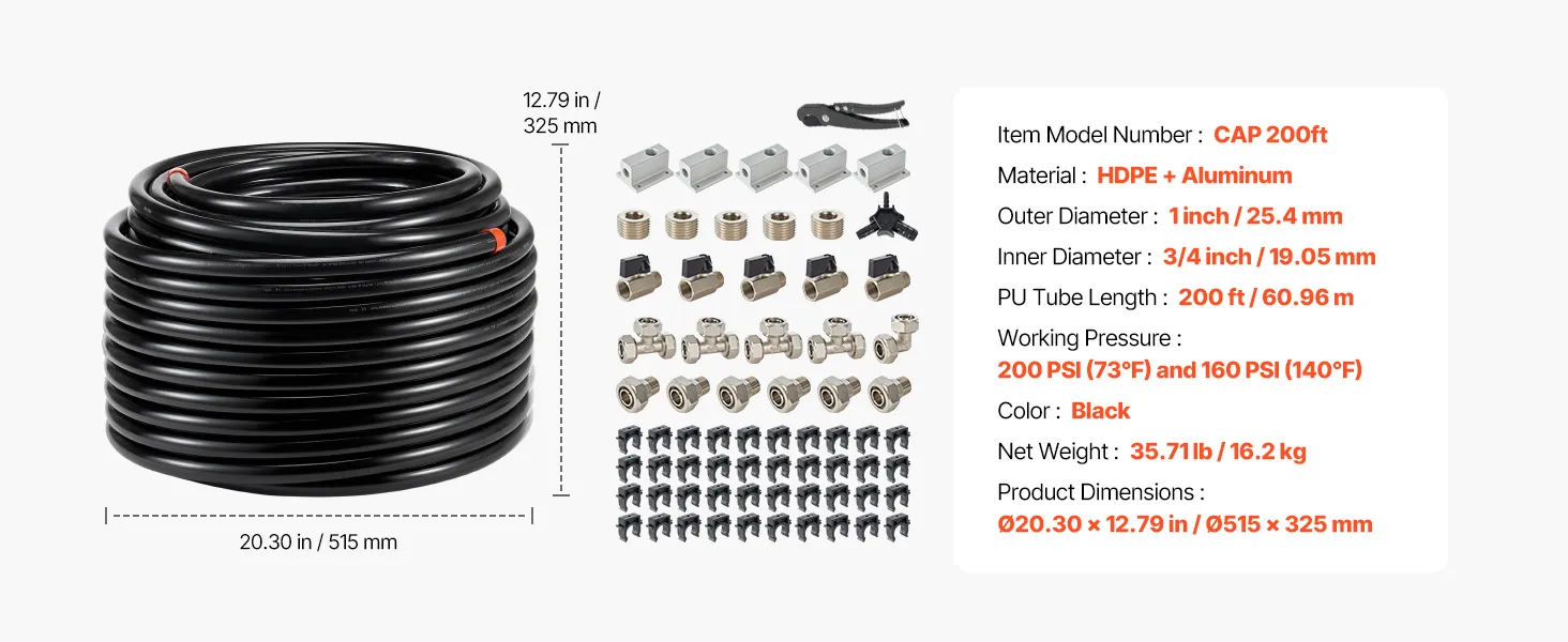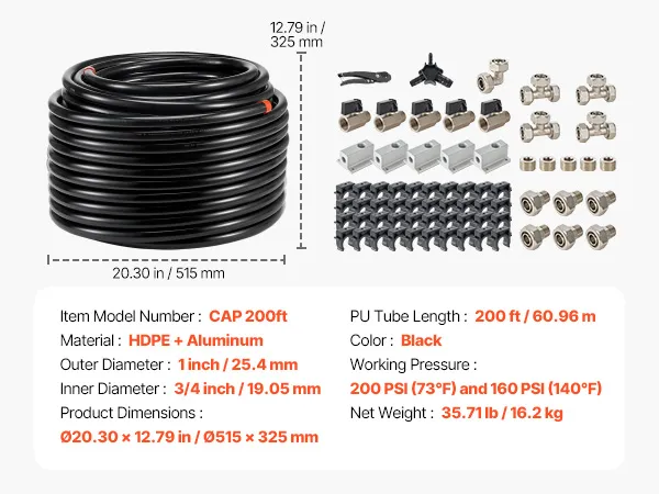 VEVOR 60m x 19mm Oro kompresoriaus vamzdžių rinkinys – HDPE-aliuminio sistema su jungtimis, sandari, iki 13.8 bar