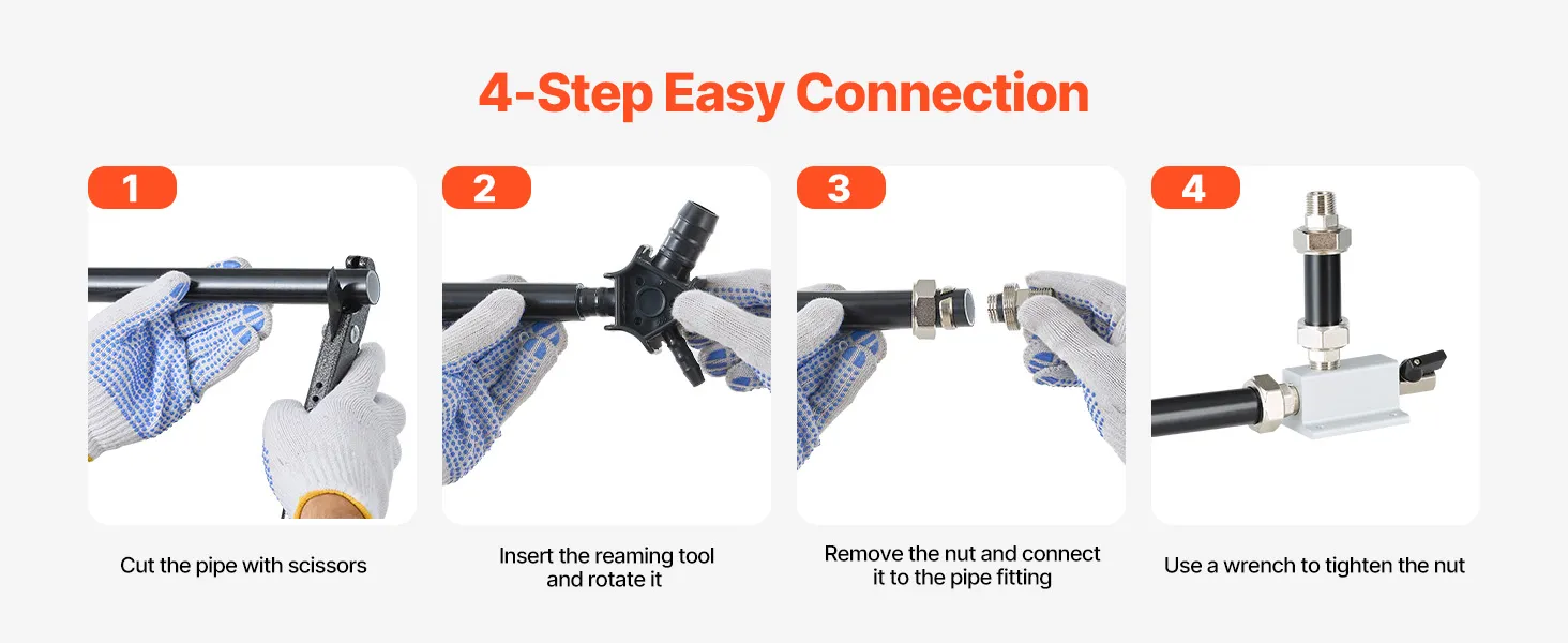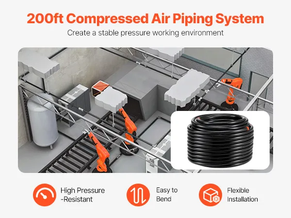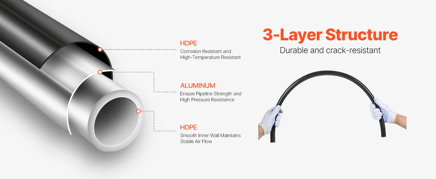 • Patikimas Slėgio Atsparumas: Jungiant puikios savybės HDPE ir aliuminio, mūsų oro kompresorius linija sistema užtikrina, išskirtinis ilgaamžiškumas ir atsparumas spaudimui. Ji veikia patikimai, pagal darbo slėgis iki 200 PSI (73°F) ir 160 PSI (140°F), suteikti jums su ilgalaikis ir patikimas, oro pristatymo sprendimą.