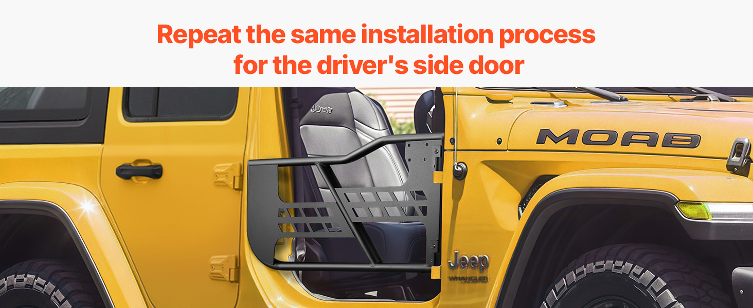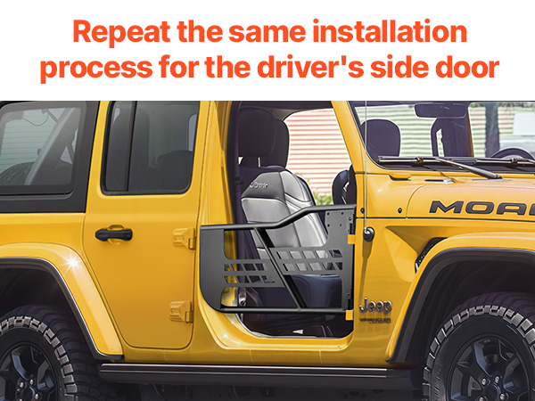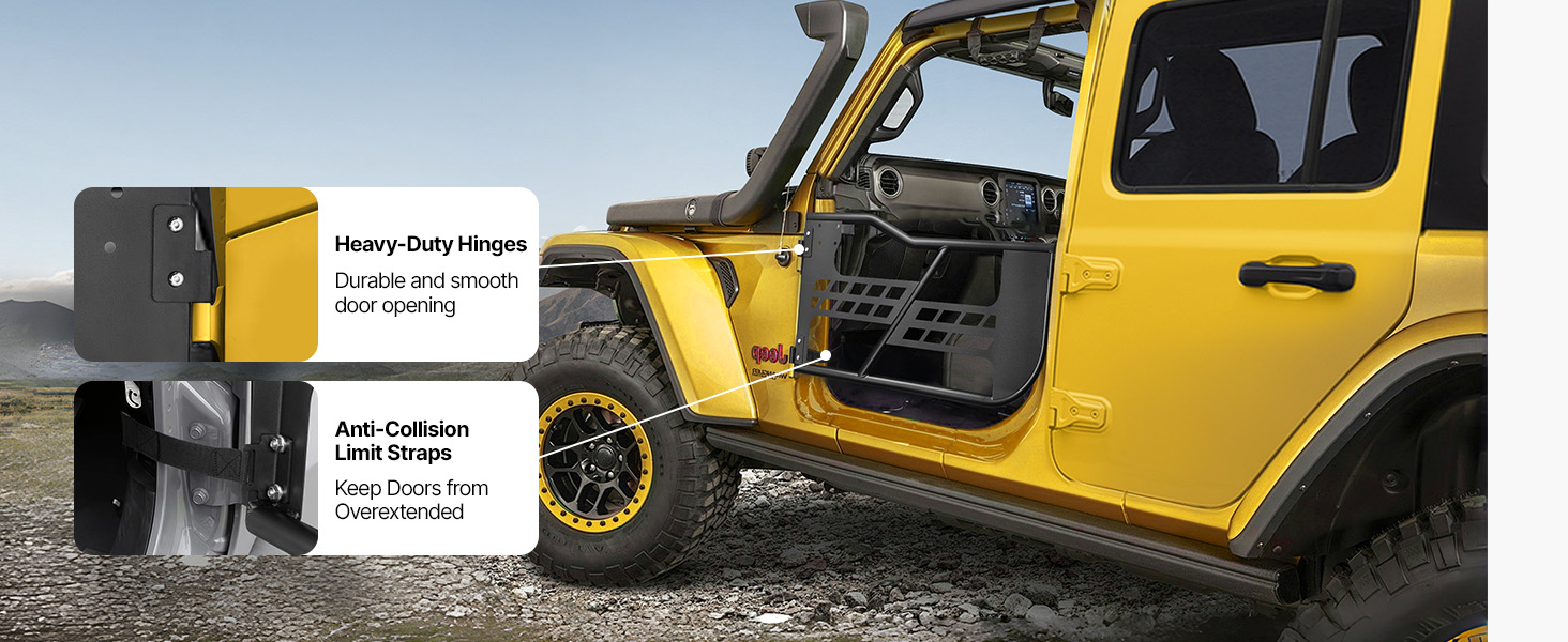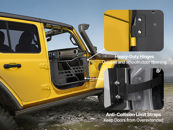 • Paprastas Įrengimas: Įrengtas su didelėms apkrovoms, vyriai, lankstai, šių jeep vamzdis, durų nereikalauja gręžimo arba suvirinimo, leidžia be jokio vargo montavimas ant gamyklos durų vyriai. Komplekte nailono riba dirželiai vengti per pratęsimą, sumažinti riziką susidūrimų.