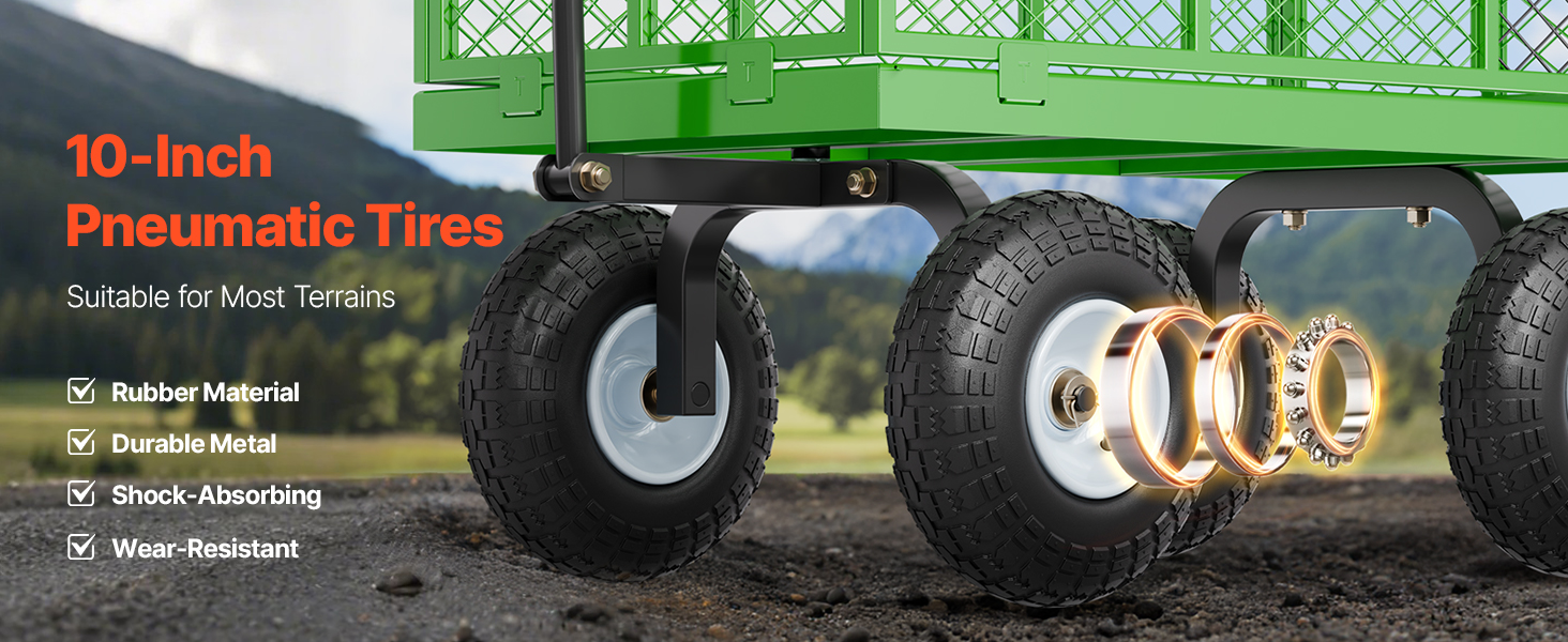 • 360° Besisukantis Ratai: Įrengtas, su 10-colių guminės padangos ir metalo mazgus, ratų šią sunkiųjų plieno sodo krepšelį užtikrinti sklandų judėjimą visoje įvairių vietovių, įskaitant žolės, purvo, akmenų ir sniego. Tvirta konstrukcija užtikrina stabilumą ir kartu sumažinti pastangas, reikalingas transportas.