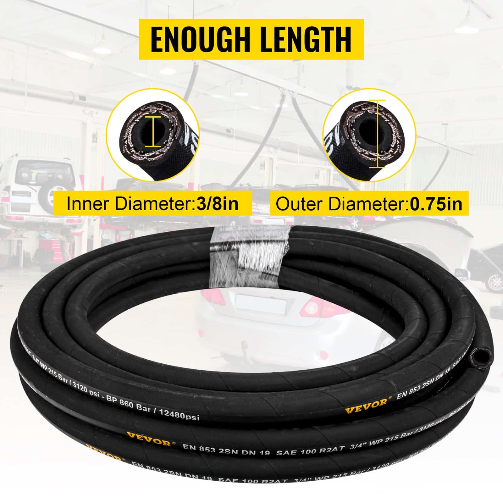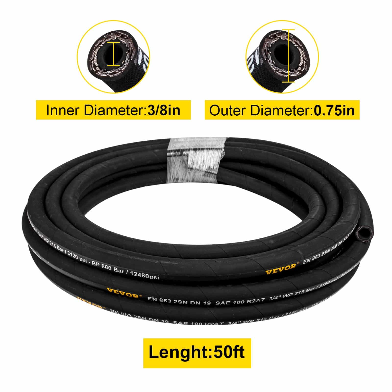 VEVOR Hydraulic Hose 3/8 inch x 50 ft, Coiled Hydraulic Hose 4800 PSI, Rubber Hydraulic Hose with 2 High-Tensile Steel Wire Braid, Bulk Hydraulic Hose -20℃ to 140℃, Hydraulic Oil Flexible Hose