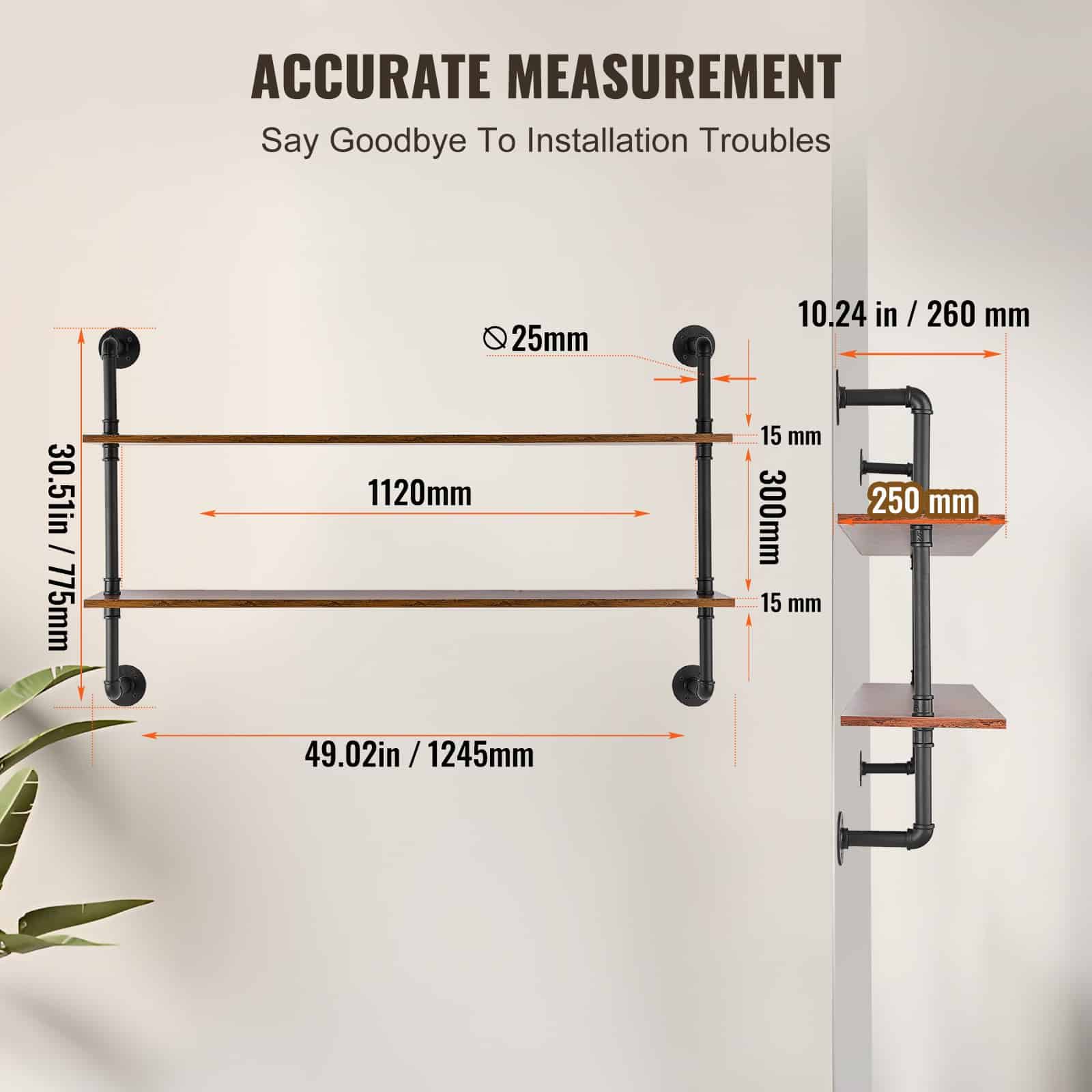 VEVOR Industrial Pipe Shelf, 2 Tier 48x 9.84in, Wall-Mount Floating Rustic Wood Shelves Bracket Display Bookshelf, Storage Rack Sundries Holder for Kitchen Bedroom Bathroom Living Room, Black