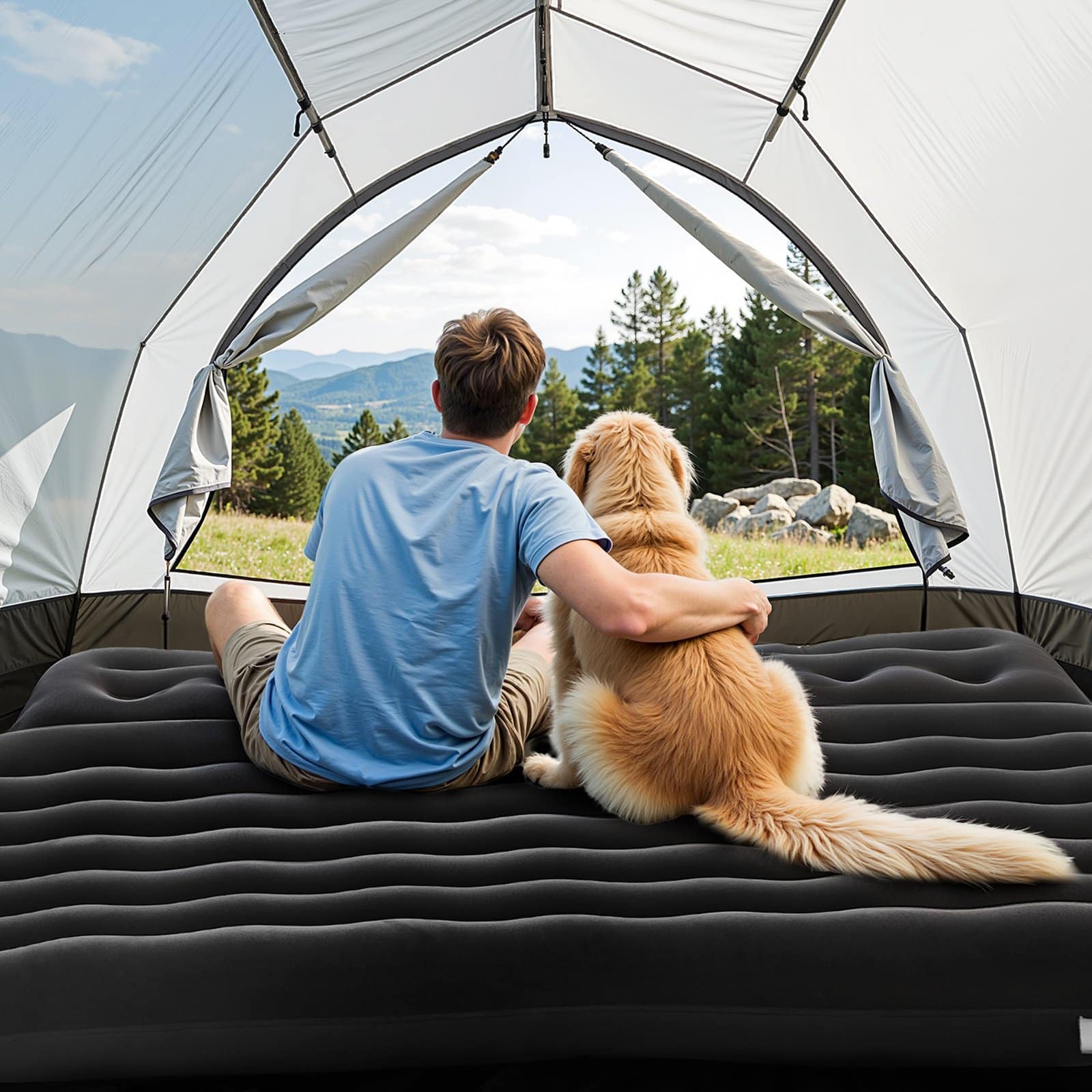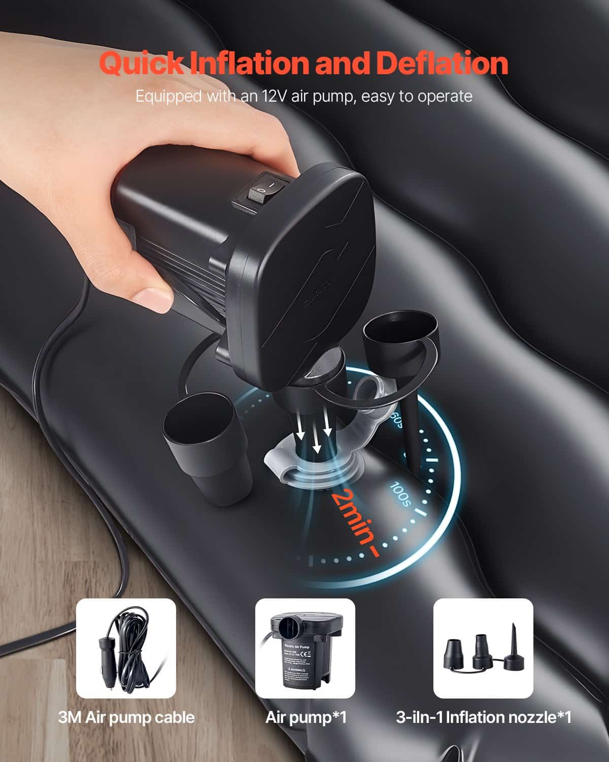 Pripučiamos pripučiami automobilių kempingas čiužinio trunka tik 2 minutes, todėl galite greitai pradėti jį naudoti. Čiužinys yra įrengta išorinė oro pompa ir trijų-in-one purškimo antgalis lengva operacija. Oro siurblys yra 3 metrų ilgio laido, leidžia tolimojo infliacija.