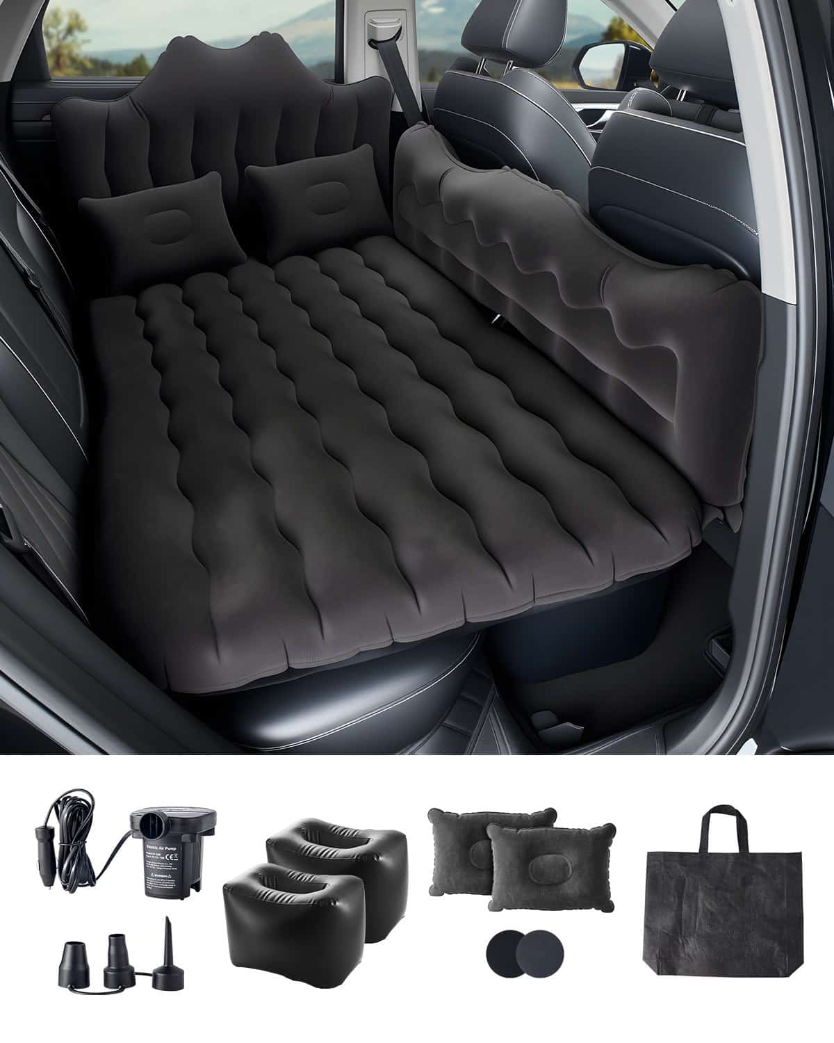 VEVOR Car Air Mattress, Inflatable Back Seat Car Camping Mattress, Flocking Travel Beds, Durable Portable Sleeping Pad with Air Pump, 2 Pillows, Nozzle, Carry Bag, Fits Most SUV MPV Sedan, Black