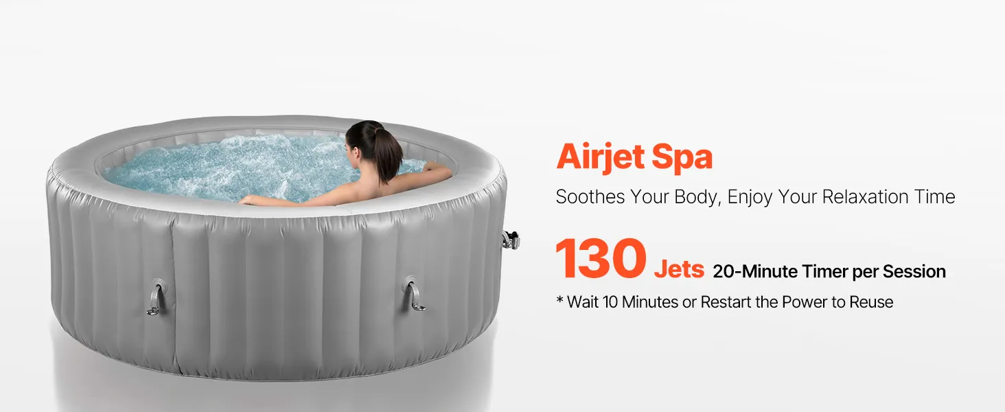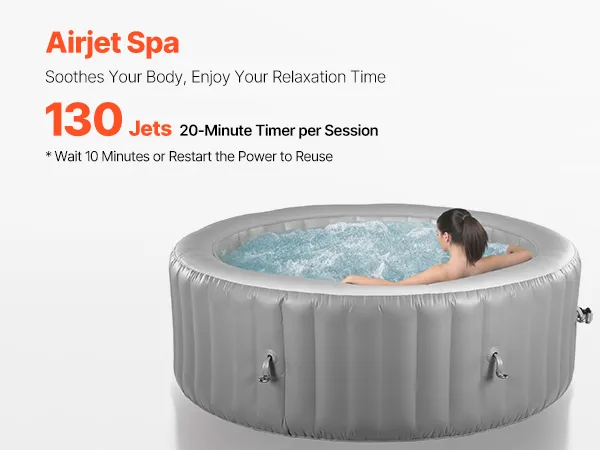 VEVOR Inflatable Hot Tub, 6 to 8 Person Capacity, 2400 x 660mm Round Portable Outdoor Spa, with 130 Soothing Jets, Headrest, LED Light, Cover, Multi-function Control Panel, PVC Outdoor Hot Tub, Grey