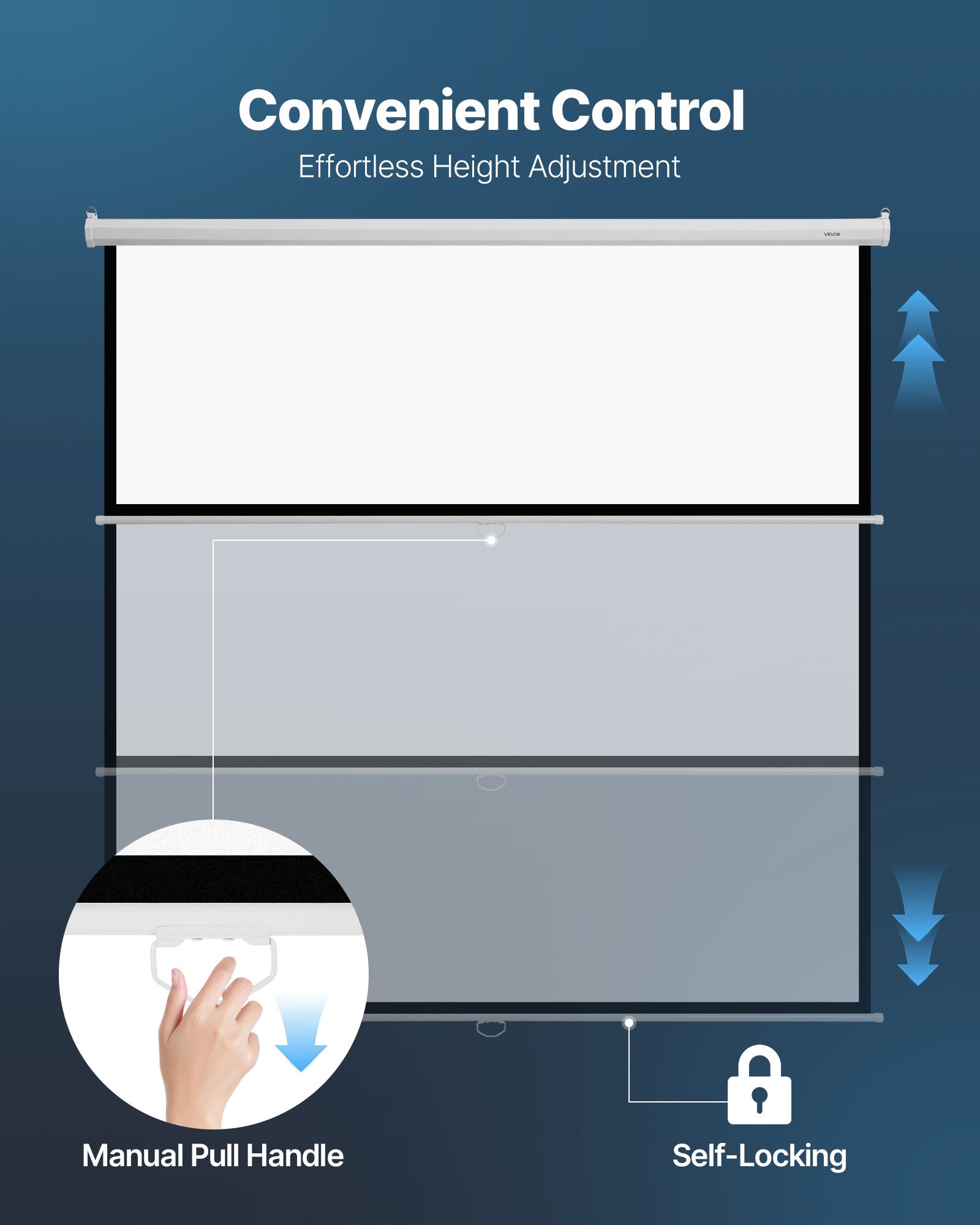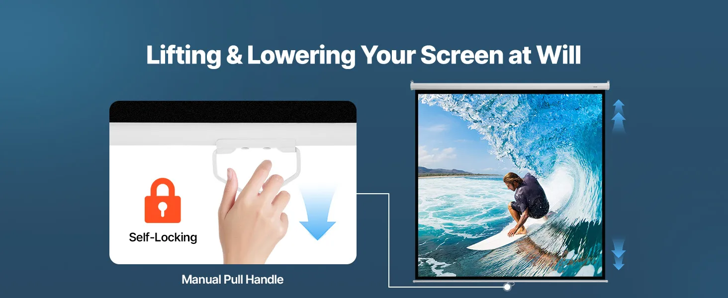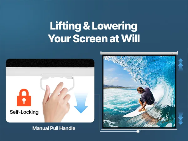 • Effortless Manual Control: For those who prefer a hands-on approach, the manual projector screen features manual pull handle, enabling you to effortlessly adjust screen to your desired height. The screen automatically locks into place for added convenience