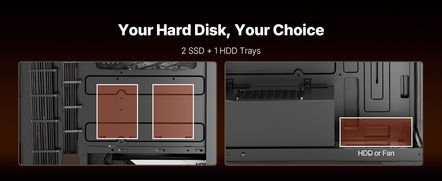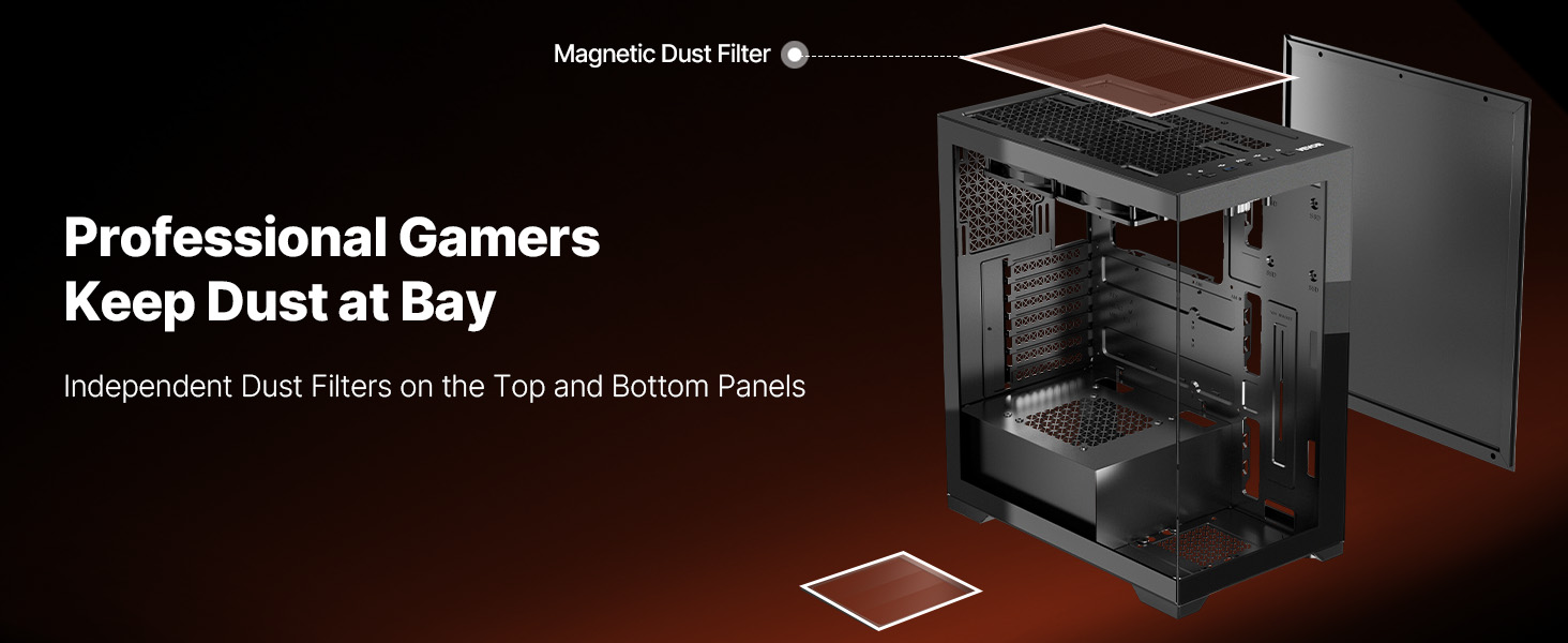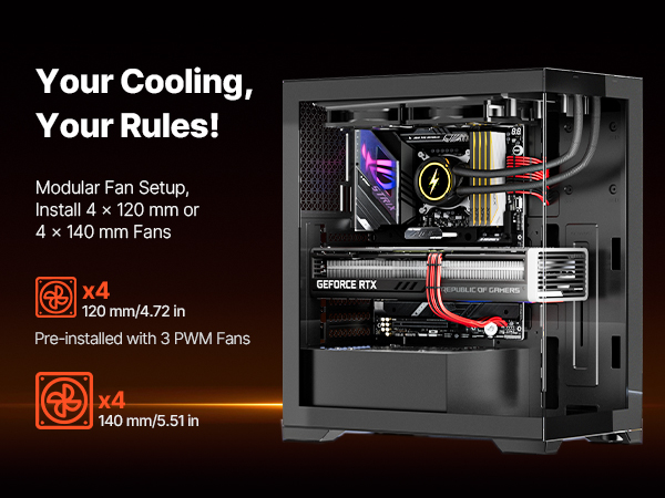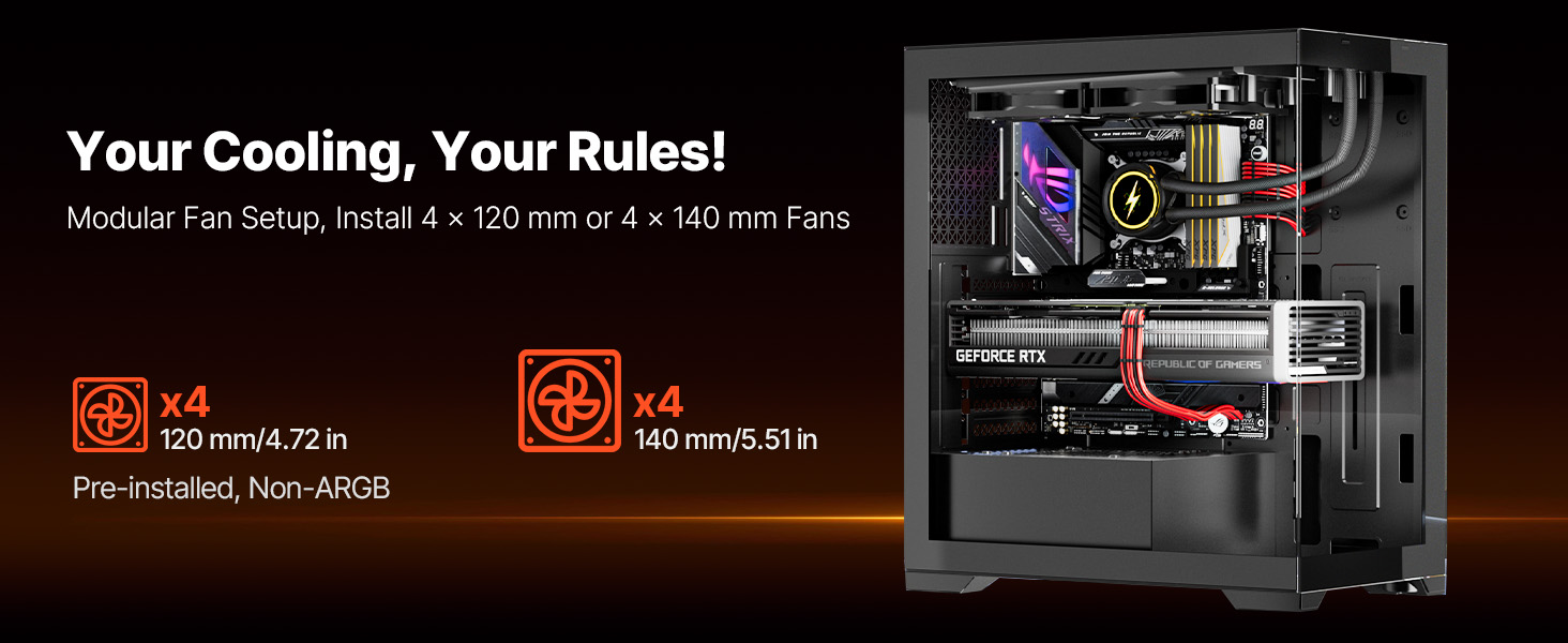 Pagaminti iš kokybės SPCC plieno ir dviejų grūdinto stiklo plokščių, šio KOMPIUTERIO atveju yra suderinamas su ATX pagrindinėse plokštėse. Jis ateina su 2 x 120 mm ventiliatoriai ir palaiko iki 4 x 120 mm arba 140 mm ventiliatorius, užtikrinti, galingų aušinimo. Jis palaiko iki 3 kietieji diskai (2 x 2,5 colių Ssd ir 1 x 3,5 colių HDD).