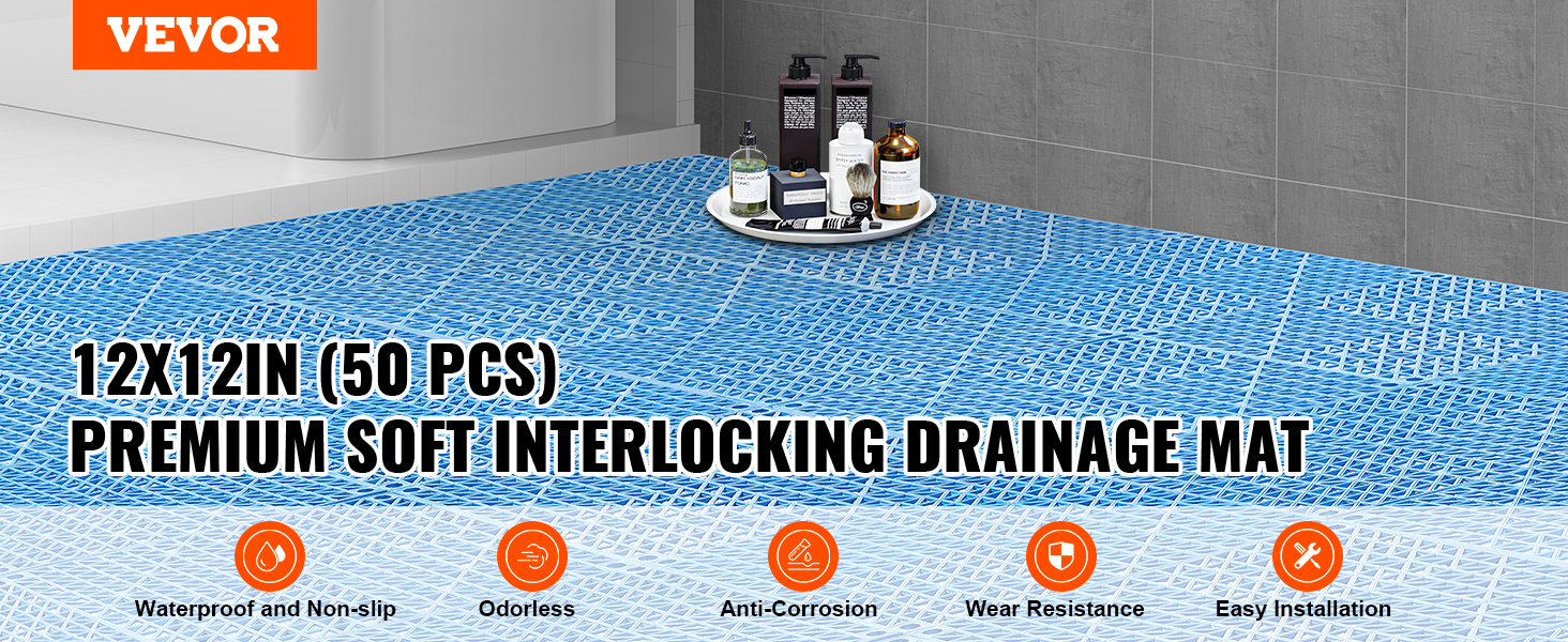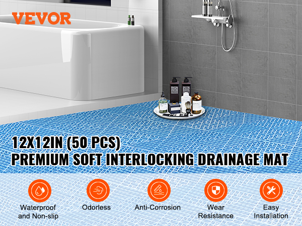 VEVOR Modular Interlocking Cushion, 50 Pack 30 x 30 cm Splicing Drainage Mats, Soft PVC Interlocking Drainage Floor Tiles, Non-Slip Drainage Holes for Restroom, Bathroom, Kitchen, Pool, Wet Area, Blue