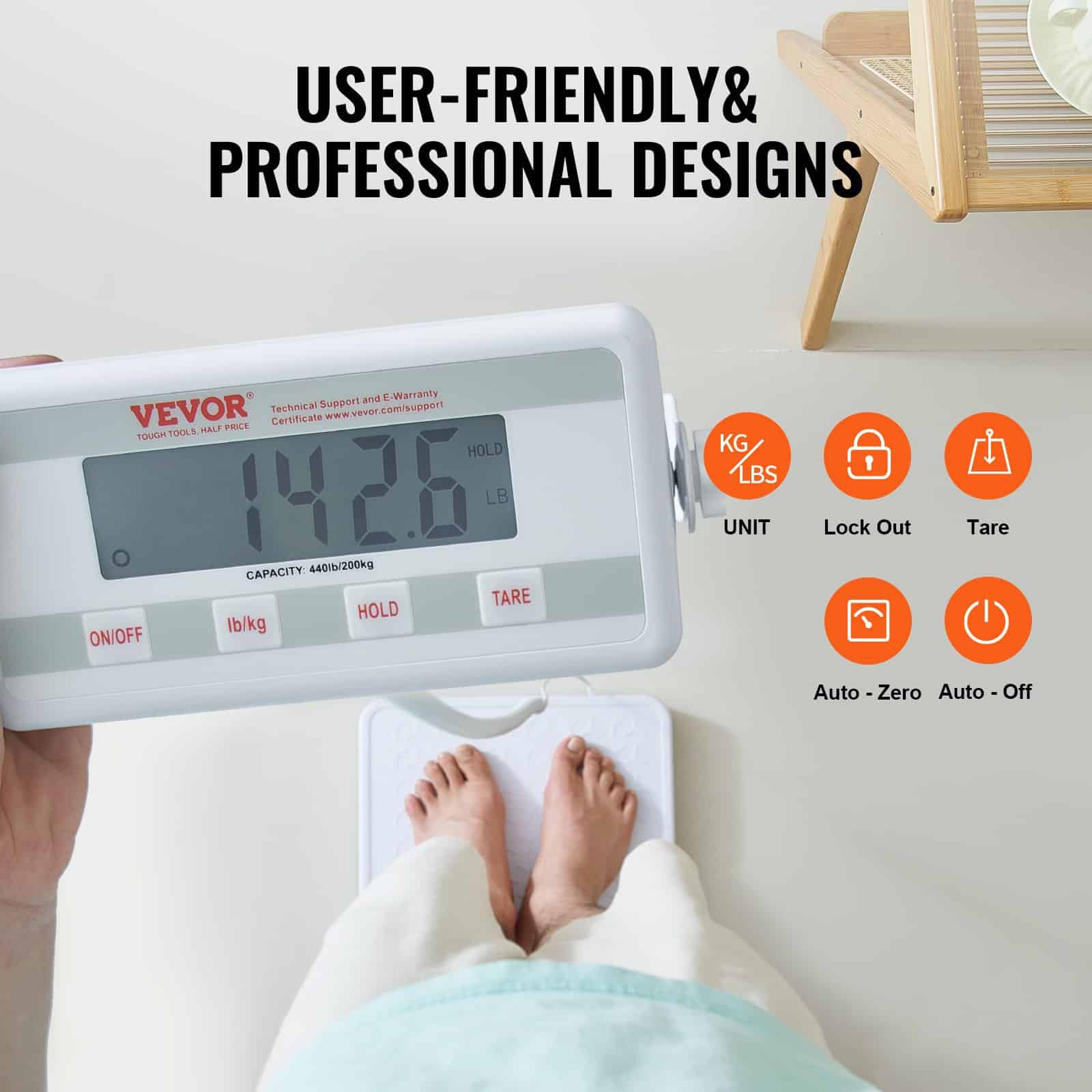 Išmatuoti tiksliai, Gyventi su Sveikatingumo — VEVOR s nešiojamų medicinos skalė yra patikimų ekspertų tiksliai svorio stebėjimas. Su talpa iki 440 £ ir keletą praktinių funkcijų, ji suteikia patikimą kūno svorio sekimo tiek namuose, tiek profesionalams.