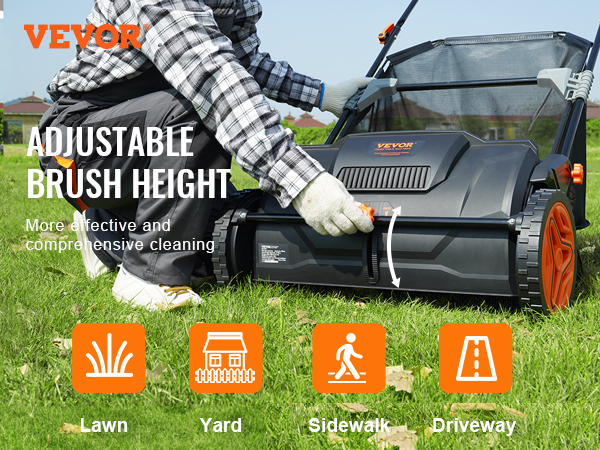 • Prisitaikyti prie Reljefo: vejos valyti skirta reguliuojamas verpimo teptuku aukštis–tiesiog nustatykite rankenėlę, rankomis judėti šepečiai aukštyn ir žemyn, nenaudojant jokių specialių įrankių. Jūs galite naudoti ją bet reljefas, nesvarbu, ar tai šaligatvis, važiuojamosios kelio dalies, kieme ar sode.
