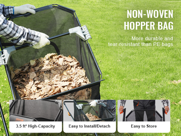 • Surinkti Daugiau Šiukšles: Mūsų kieme sweeper yra aukštos kokybės neaustinių bunkerį maišelį su didelės talpos 3,5 ft3, leidžia surinkti daugiau žolės, lapų ir šiukšlių ne vieną kartą be dažnai dempingo. Tai paprasta nuimti nuo rėmo ir greitai iškelties, kai valymas baigtas.