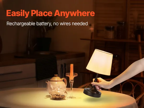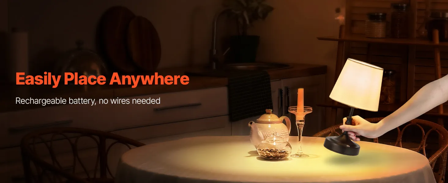 VEVOR Cordless Table Lamp, 5200mAh Built-in Rechargeable Battery Small Desk Lamp, 3-Level Brightness, Fabric Shade, 2700-3000K Color Temperature, Table Light for Restaurant, Bedroom, Bars, Black