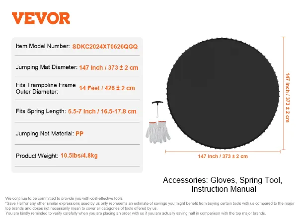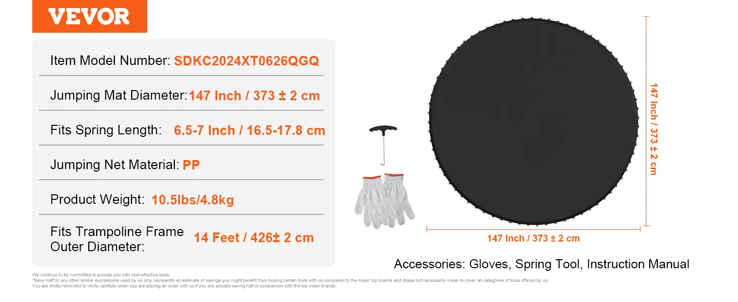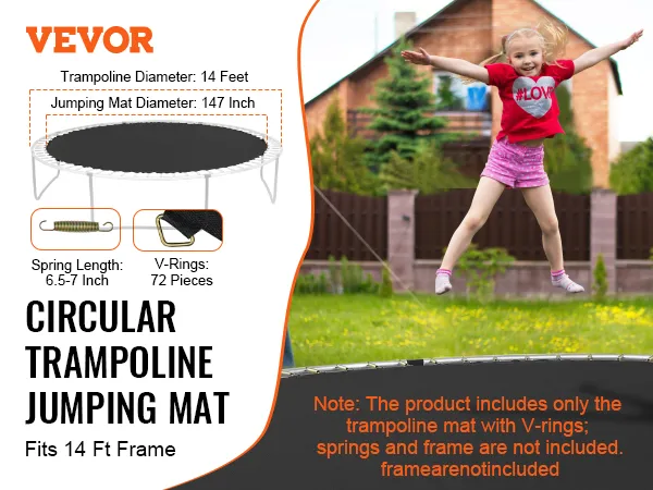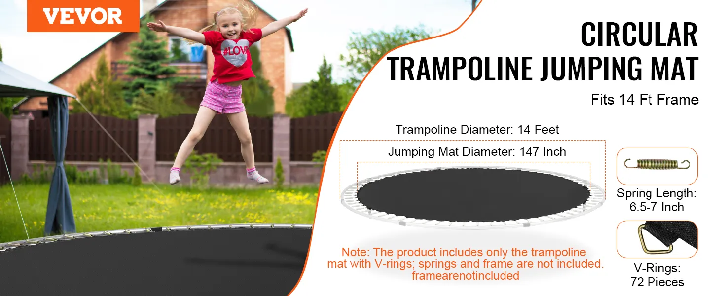 VEVOR Replacement Trampoline Mat, Jumping Mat Fits 14ft Frame, Universal Jumping Mat for 14ft Round Trampoline, Reinforce UV-Resistant Mat with Spring Tool & Durable V-Rings, Fit 6.5"-7" Spring Length