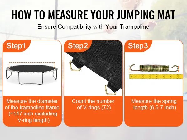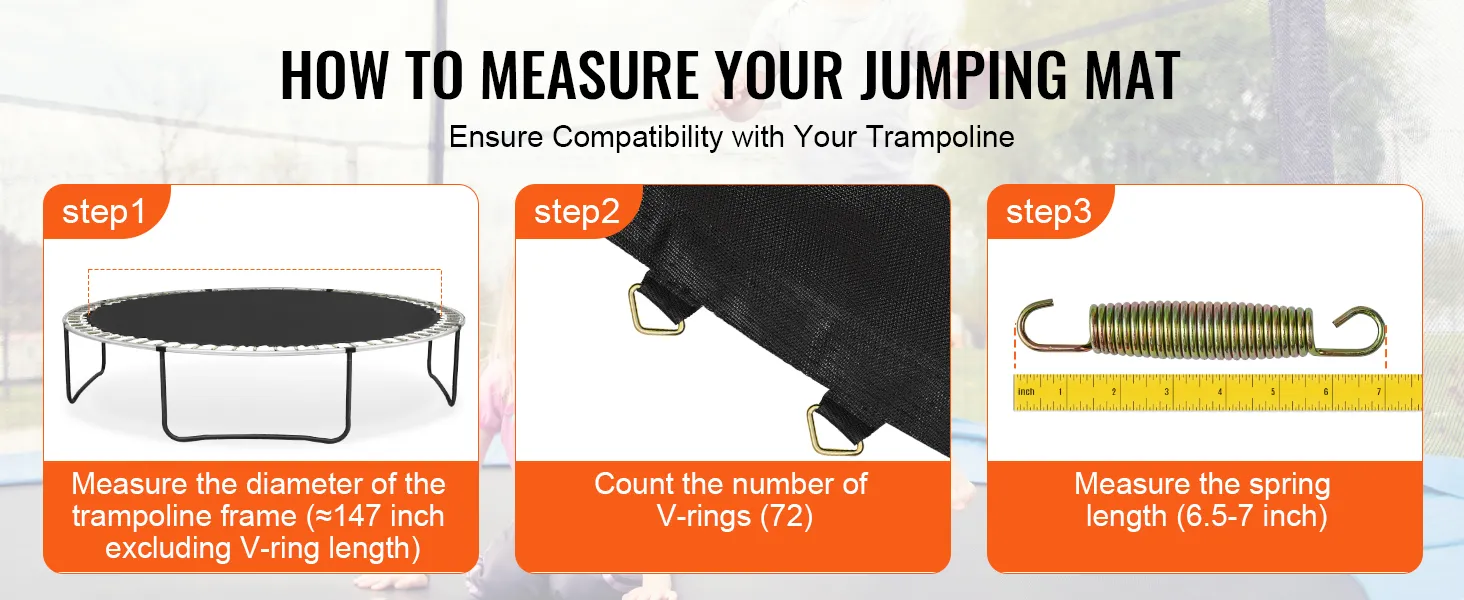 Nustatyti suderinamumas: 1. Priemonė skersmuo originalus batutas kilimėlis (išskyrus V-žiedas ilgis). 2. Suskaičiuoti V-žiedai ant originalaus batutas. 3. Priemonė pavasario ilgio.