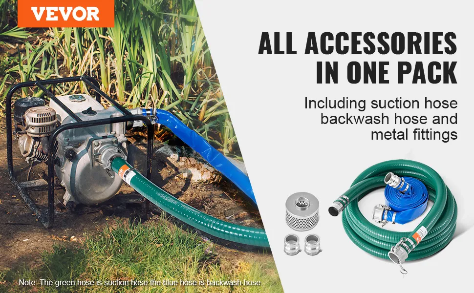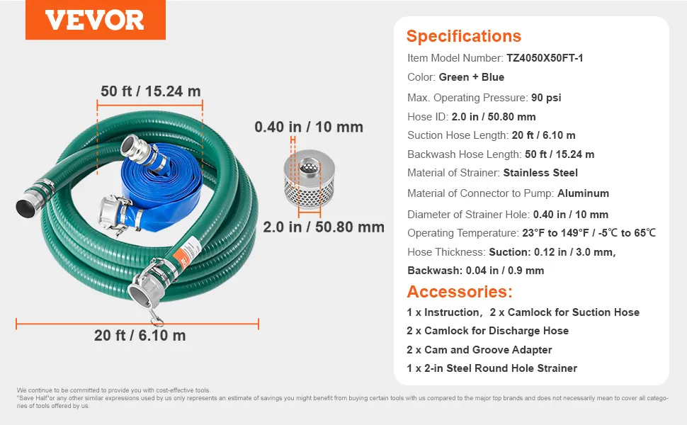 VEVOR Suction Hose Kit for Water Pump, with 51 mm(2 in) x 15.2 m(50 ft) Blue Backwash Hose, 6.1 m(20 ft) Green Suction Hose, and Steel Round Hole Strainer, Camlocks, Clamps, Cam & Groove Adapter, for Multiple Purposes