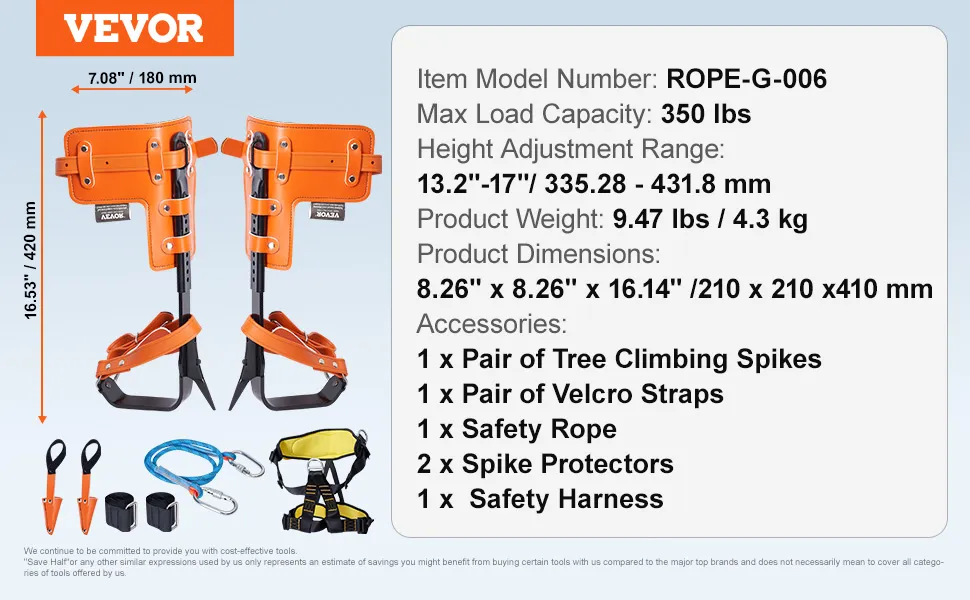 VEVOR Tree Climbing Spikes Set, 1 Pair Alloy Steel Climbing Spurs with Safety Rope and Safety Harness, 350lbs Load Capacity Tree Climbing Gear, Arborist Equipment for Climbers, Fruit Picking, Orange